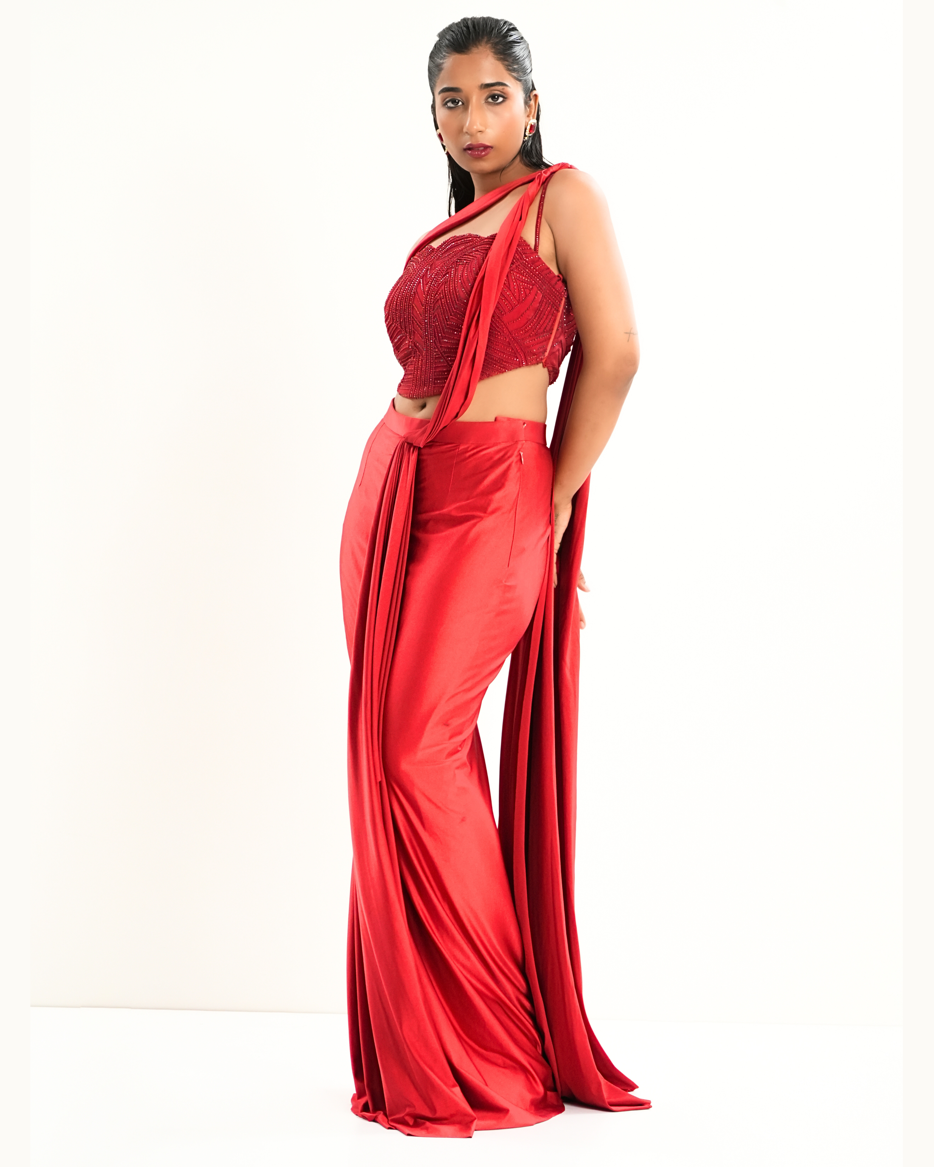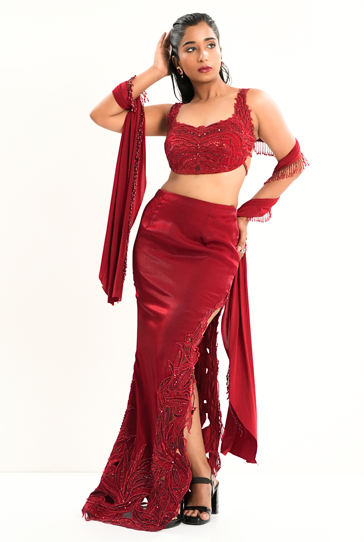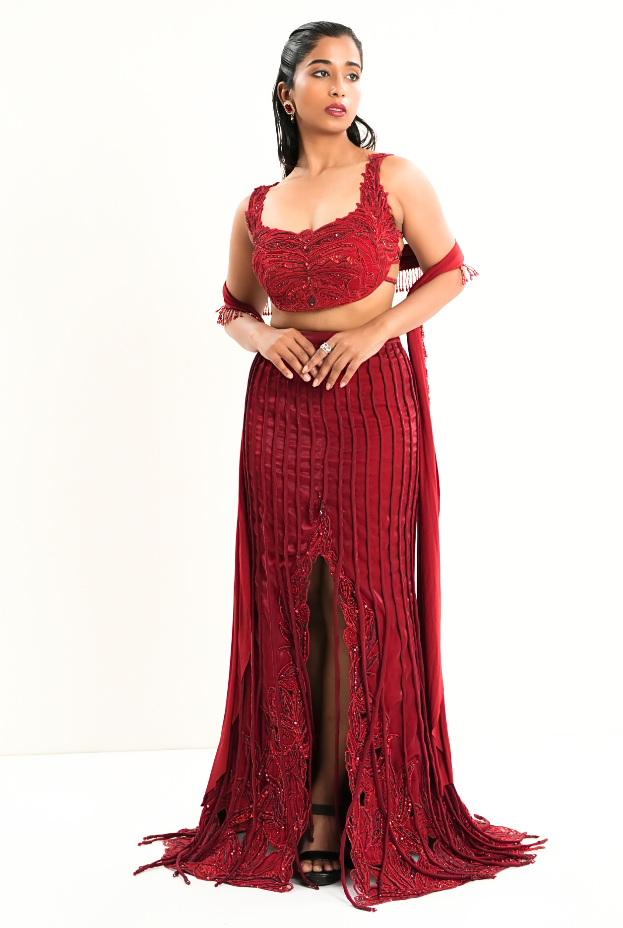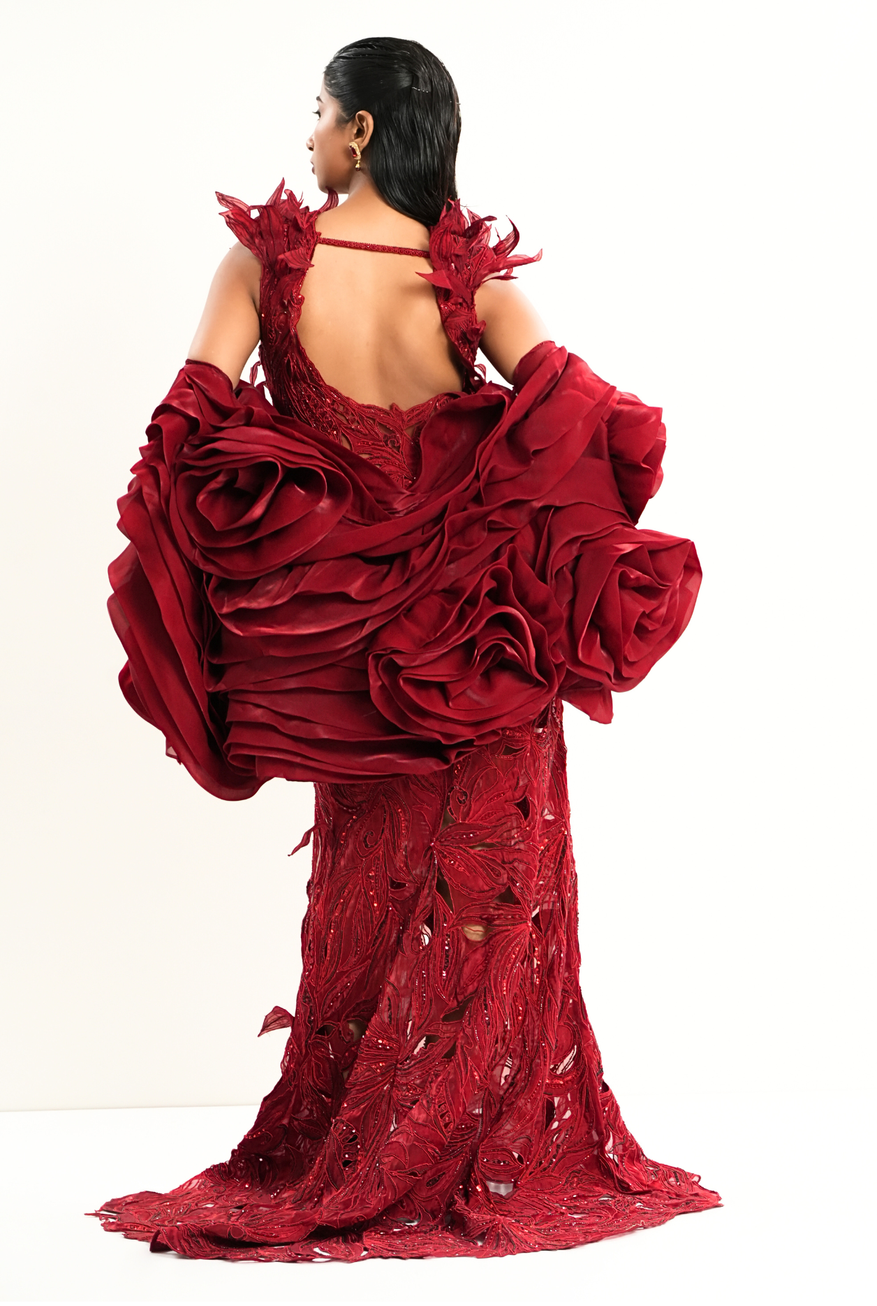Submerged in the captivating beauty of deep red garnet, this gown is pure poetry in motion. It commands attention with its sleek mermaid silhouette and mesmerizes with a truly unique Rose-Shaped Cape.