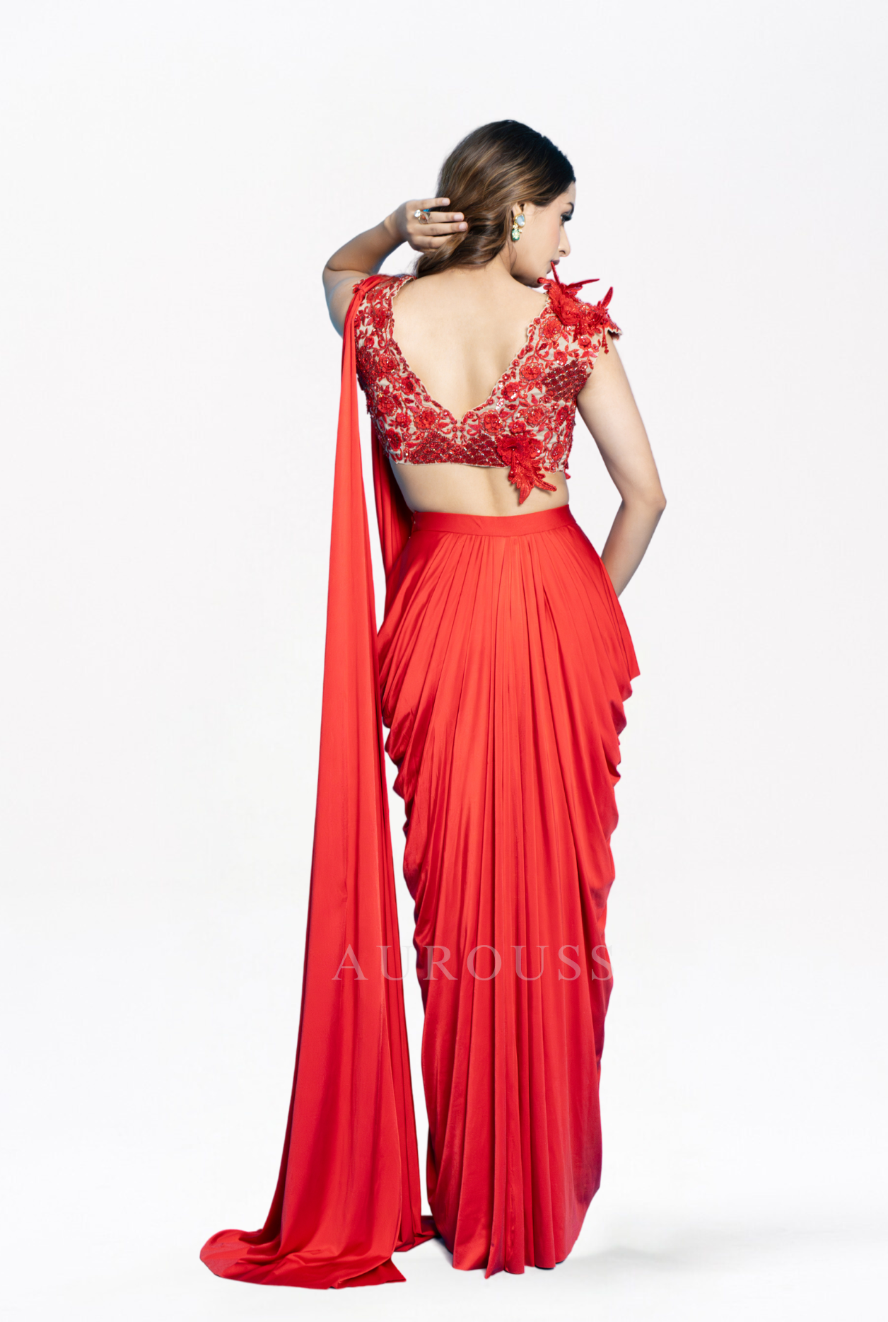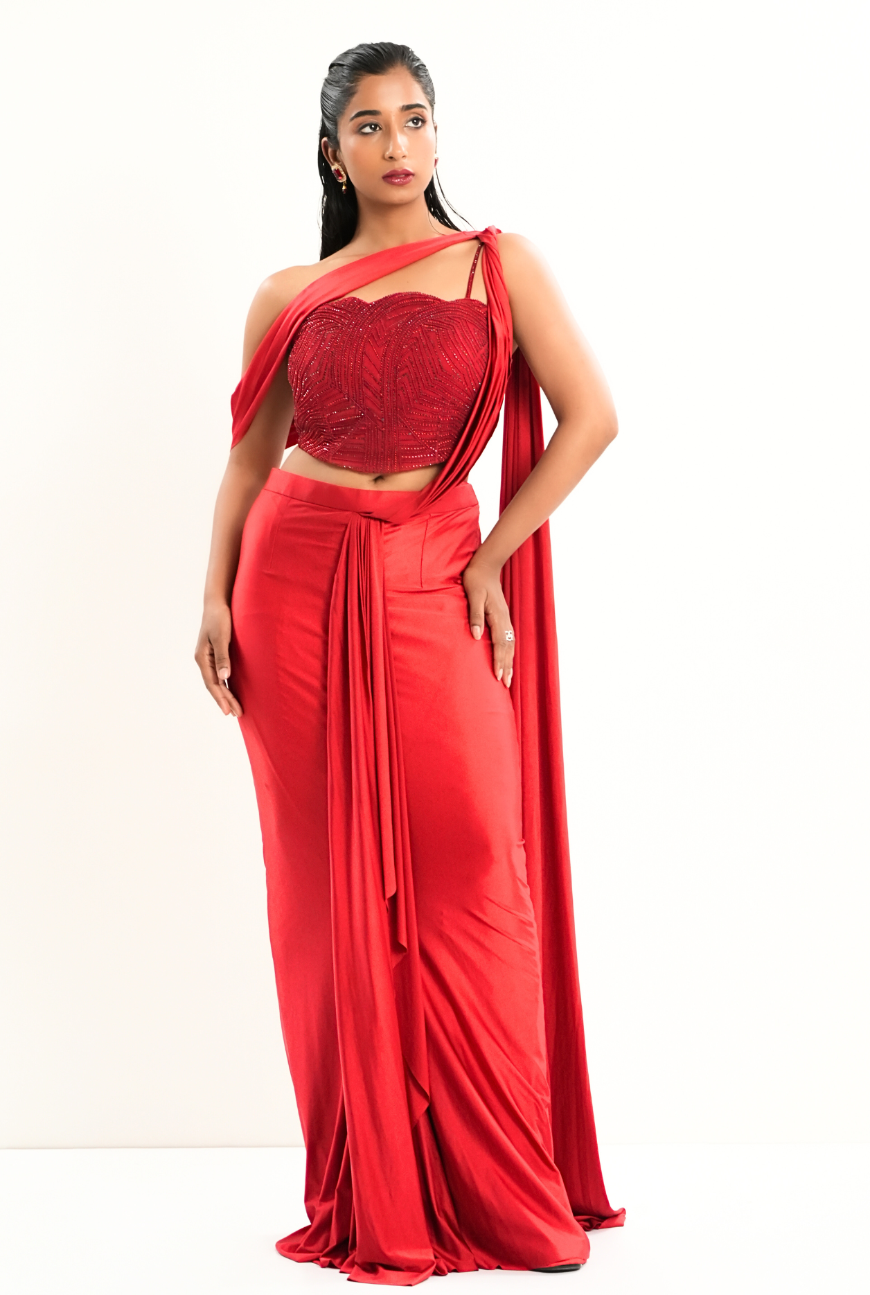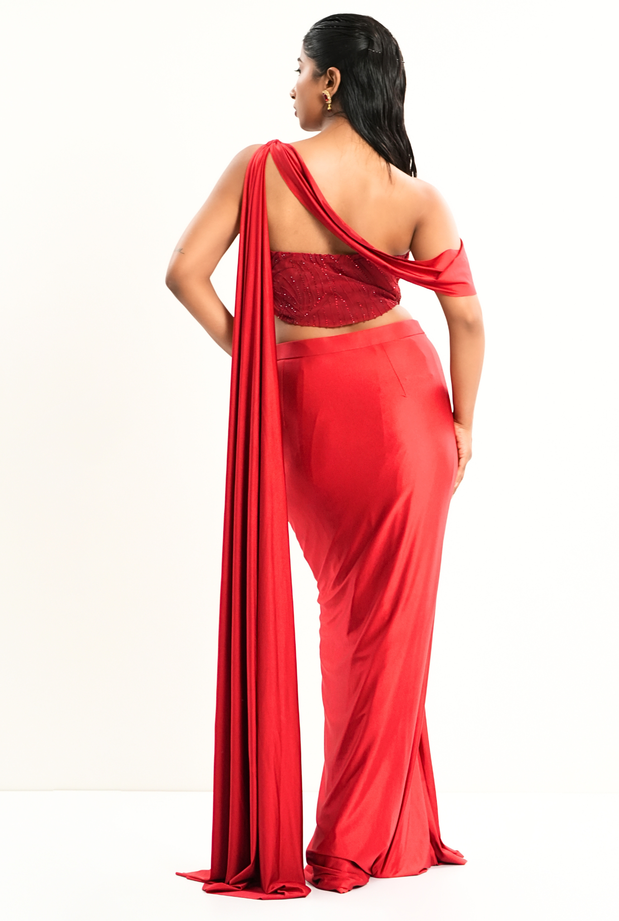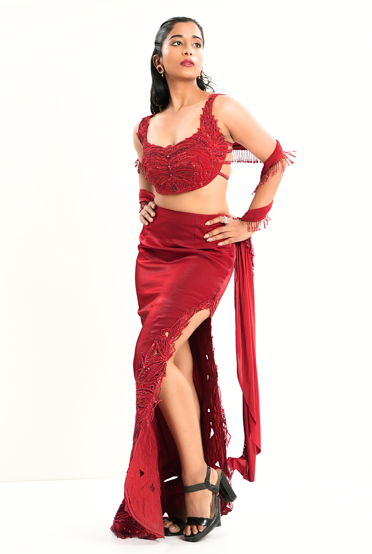 Submerged in the captivating beauty of deep red garnet, this gown is pure poetry in motion. It commands attention with its sleek mermaid silhouette and mesmerizes with a truly unique Rose-Shaped Cape.