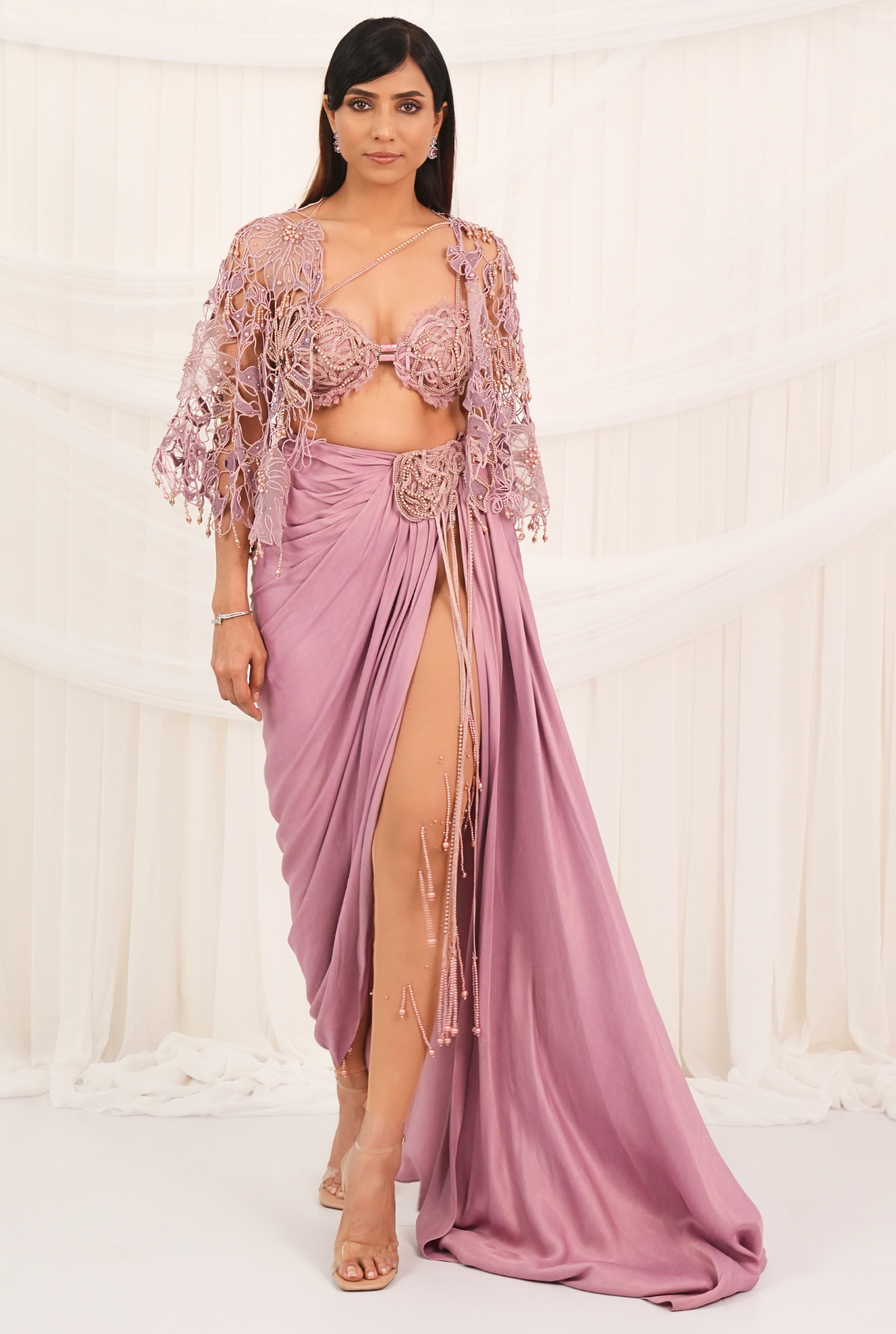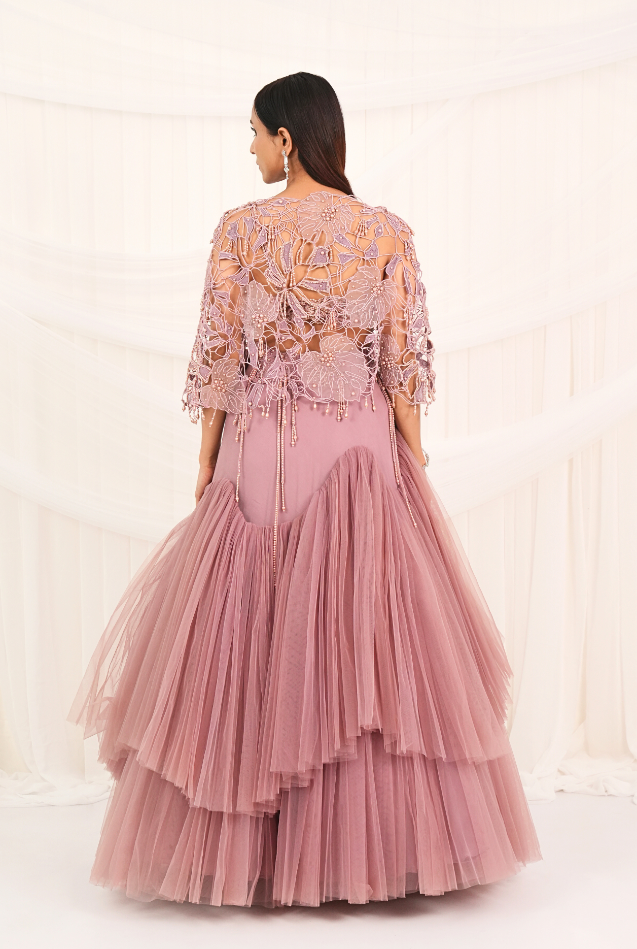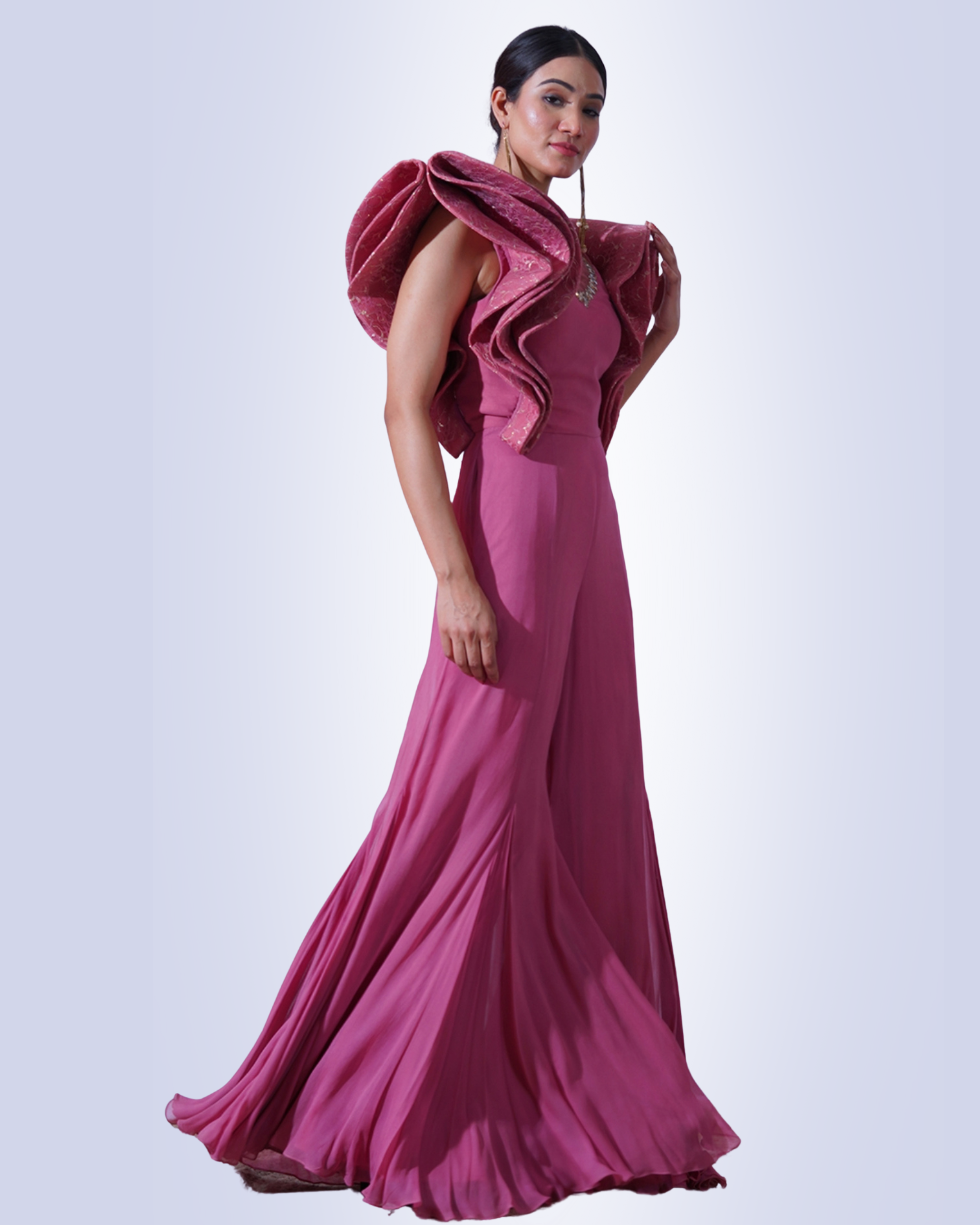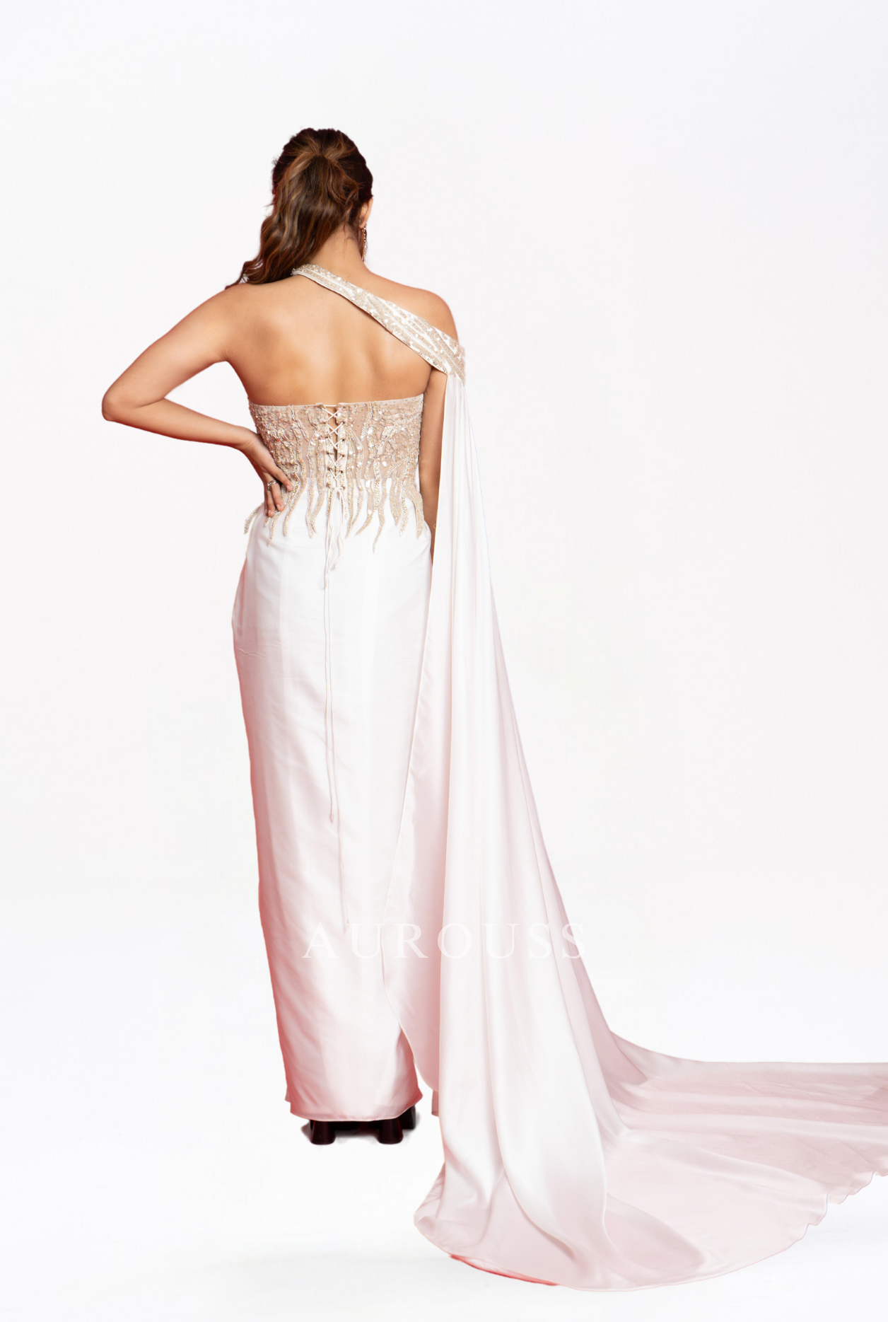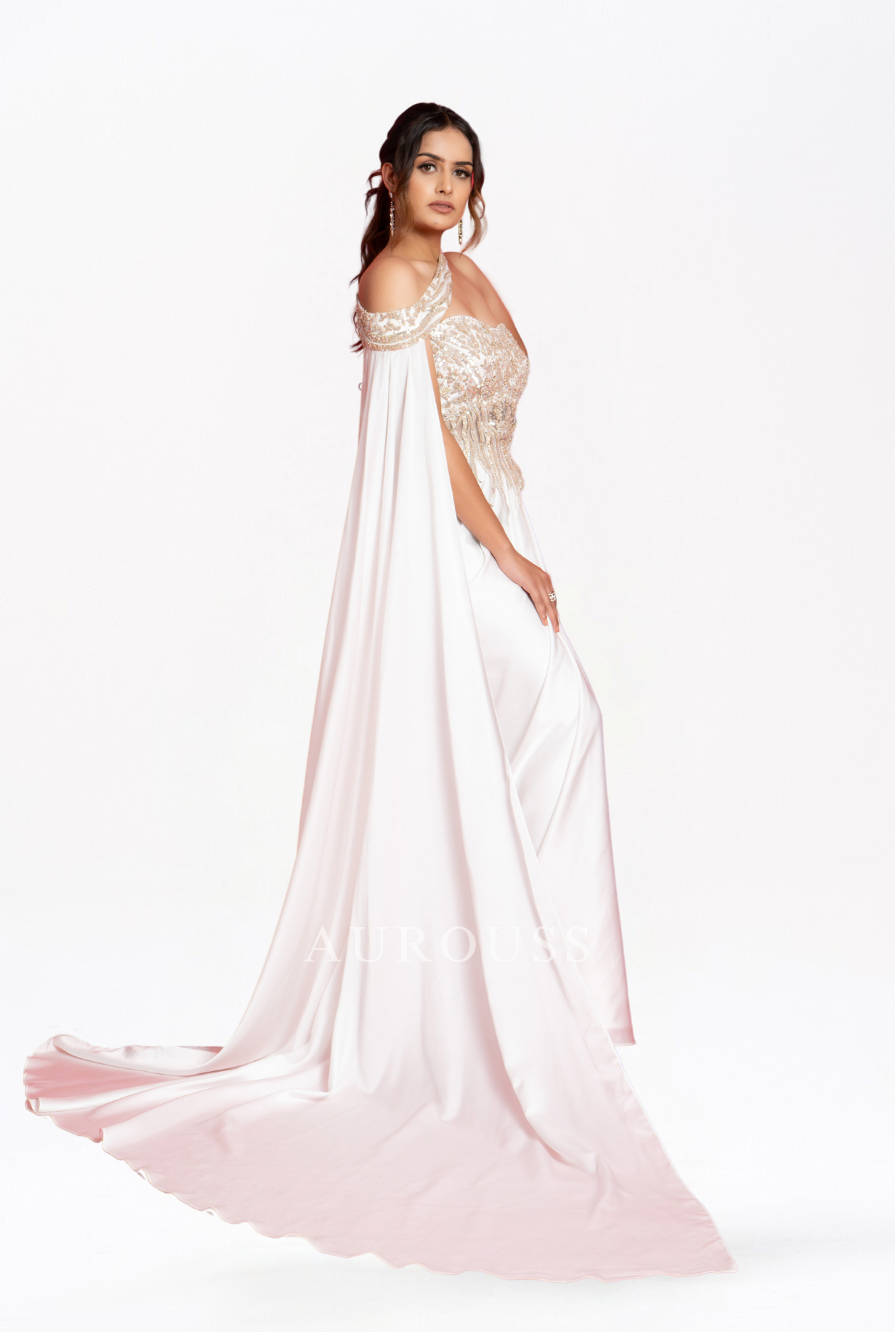 Submerged in the captivating beauty of deep red garnet, this gown is pure poetry in motion. It commands attention with its sleek mermaid silhouette and mesmerizes with a truly unique Rose-Shaped Cape.