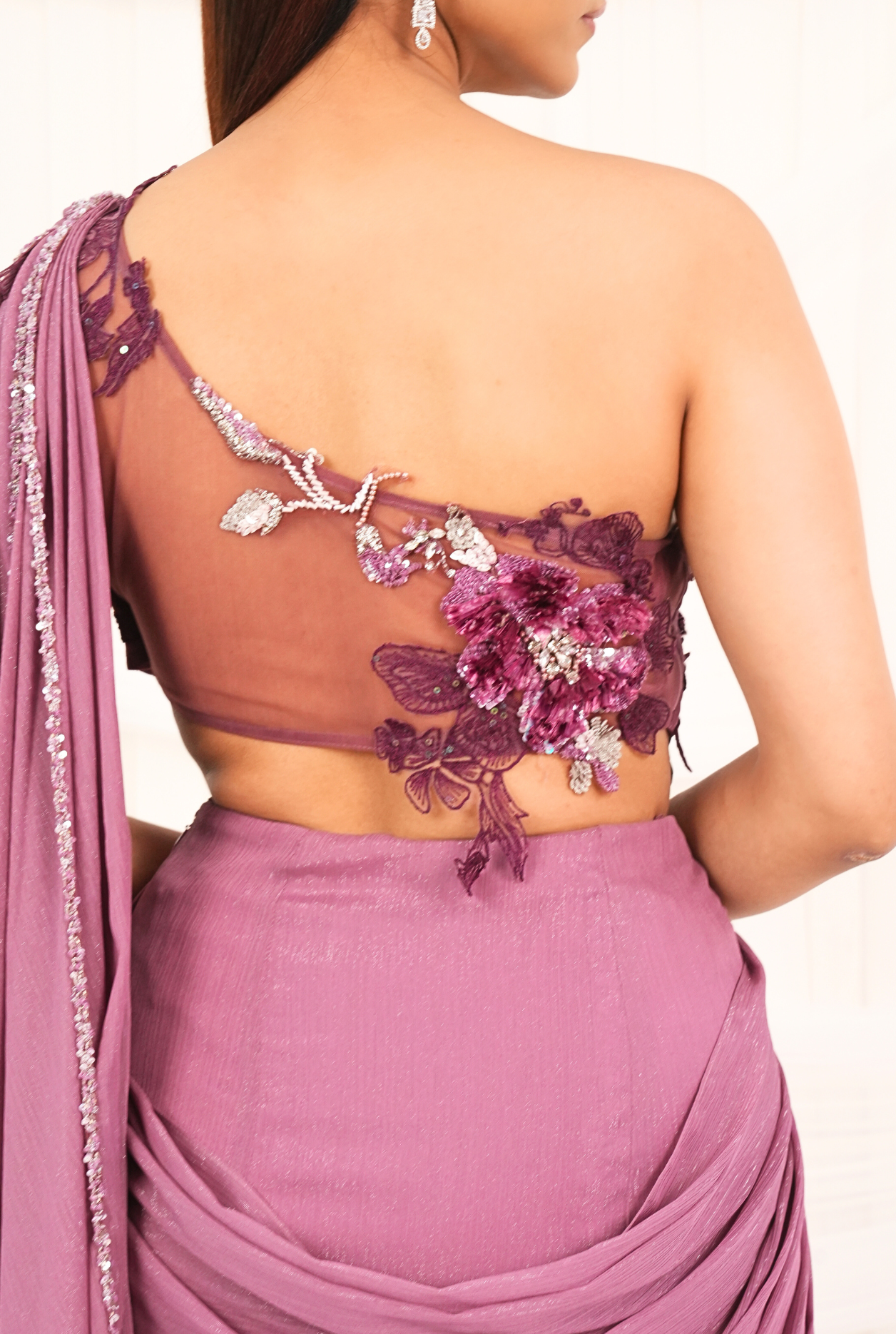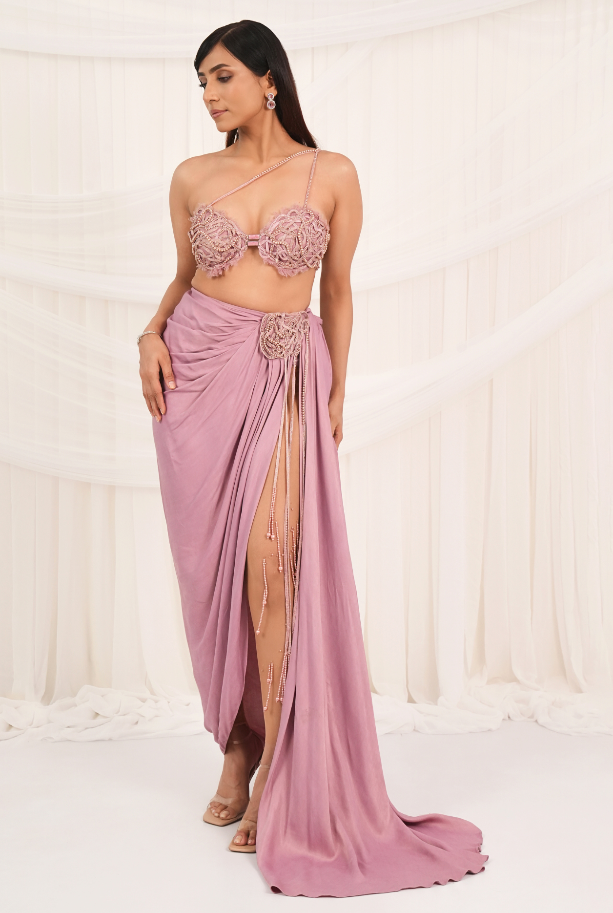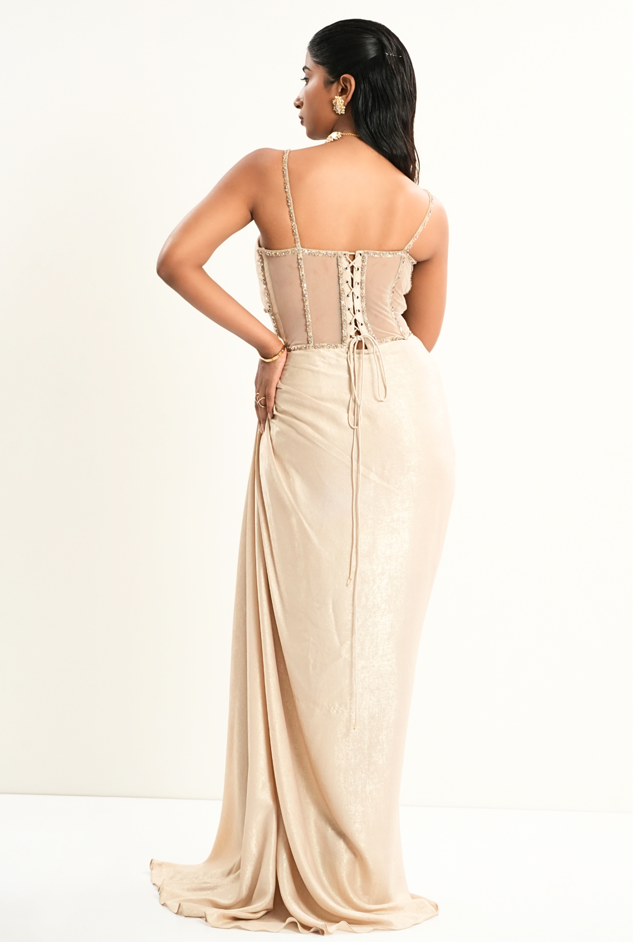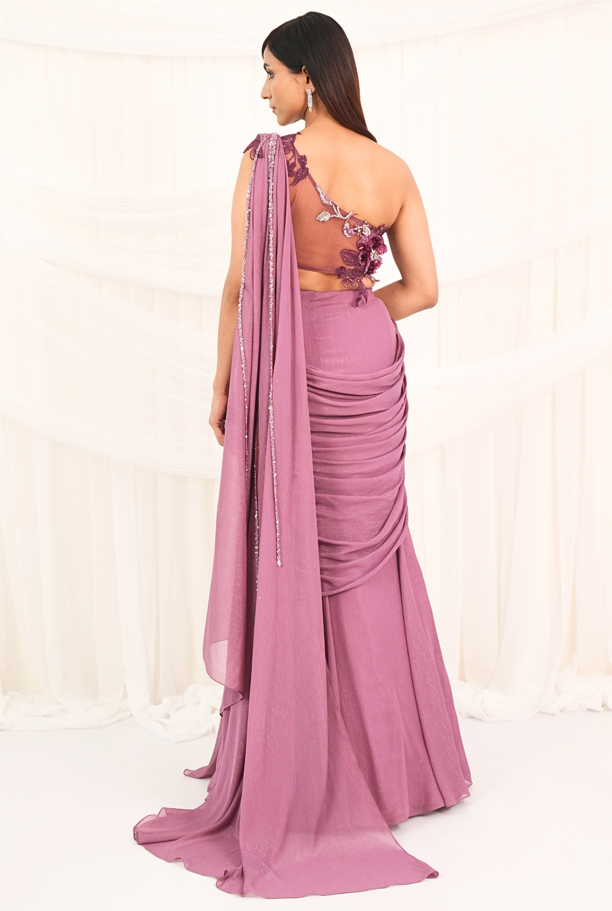 Submerged in the captivating beauty of deep red garnet, this gown is pure poetry in motion. It commands attention with its sleek mermaid silhouette and mesmerizes with a truly unique Rose-Shaped Cape.