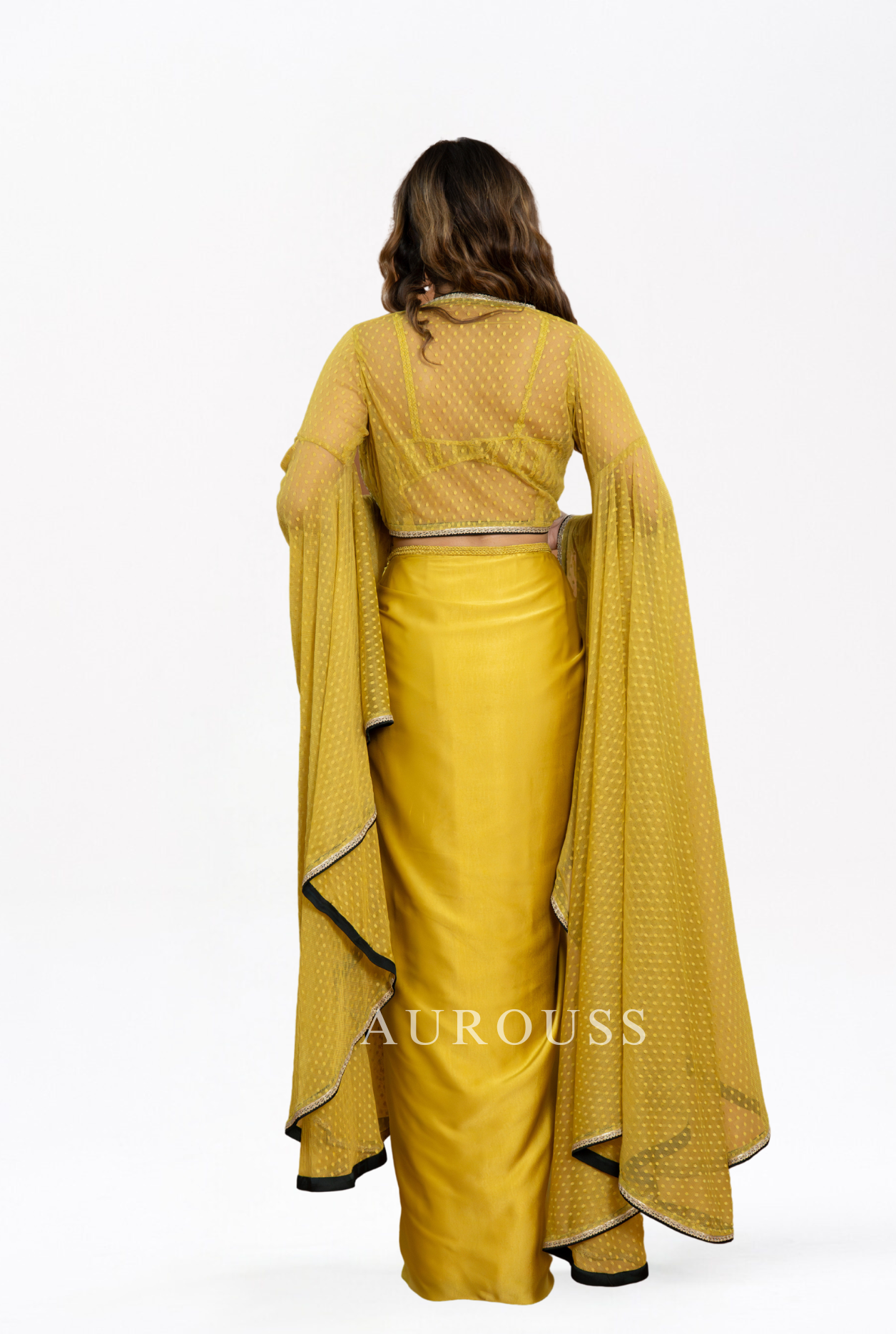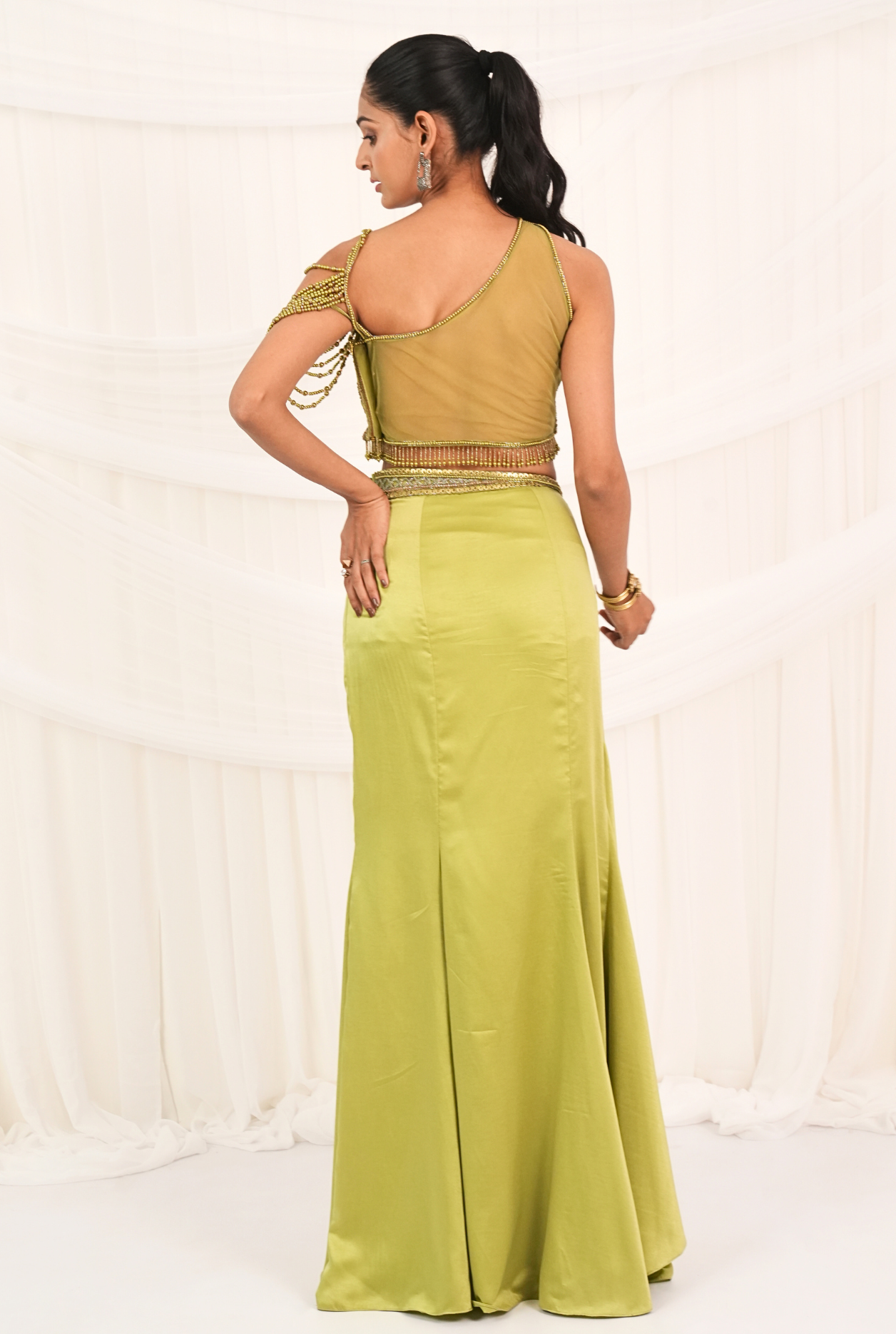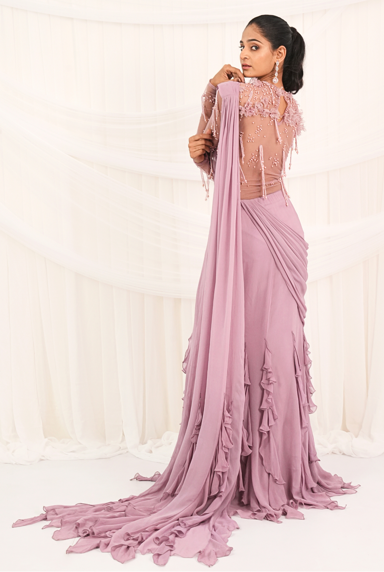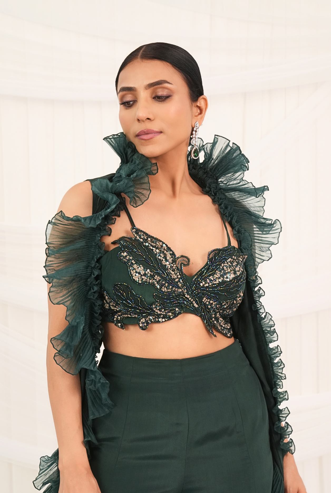 Submerged in the captivating beauty of deep red garnet, this gown is pure poetry in motion. It commands attention with its sleek mermaid silhouette and mesmerizes with a truly unique Rose-Shaped Cape.