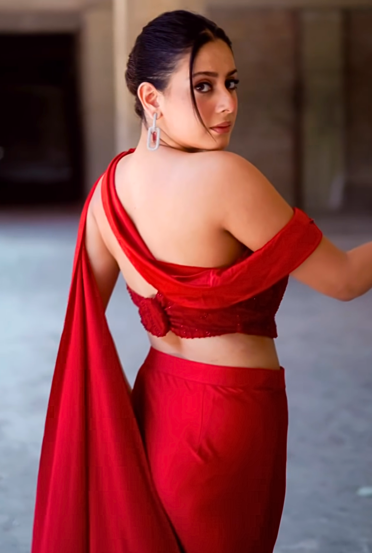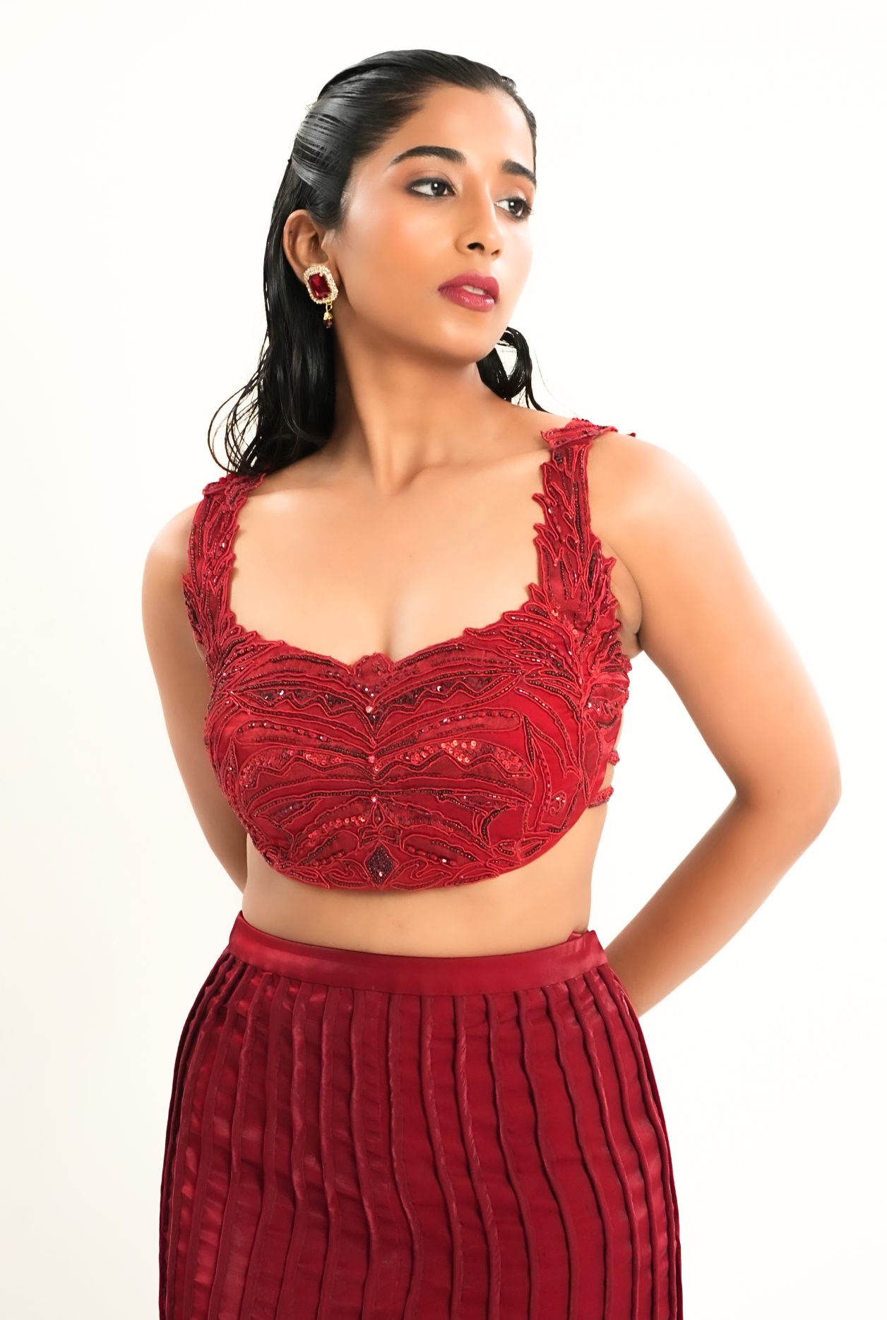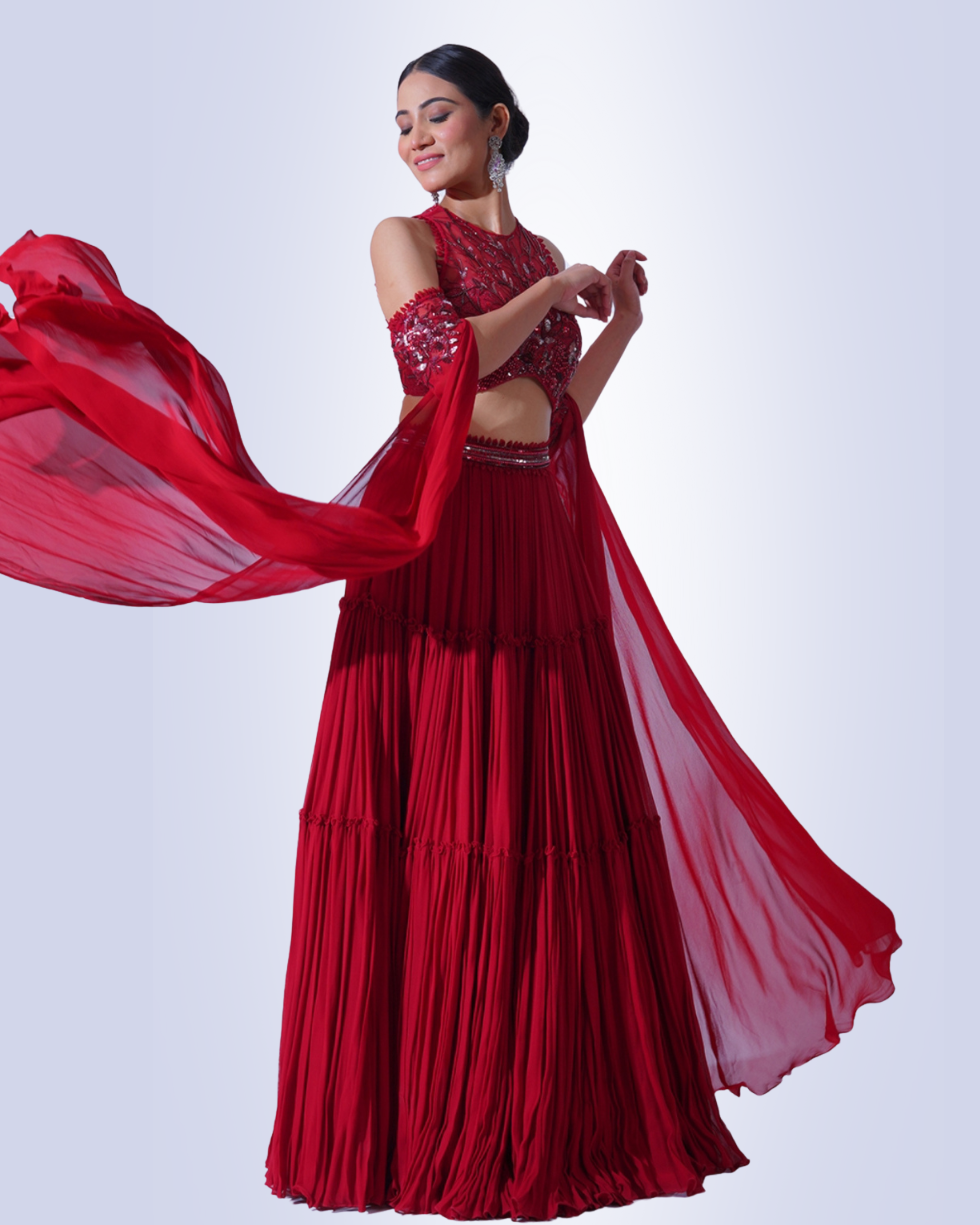The craftsmanship is unparalleled: a rich tapestry of intricate patchwork, fine dori, and elegant cutwork, brought to life by the brilliant sparkle of hand-embroidered red crystals, cutdana, and sequins.