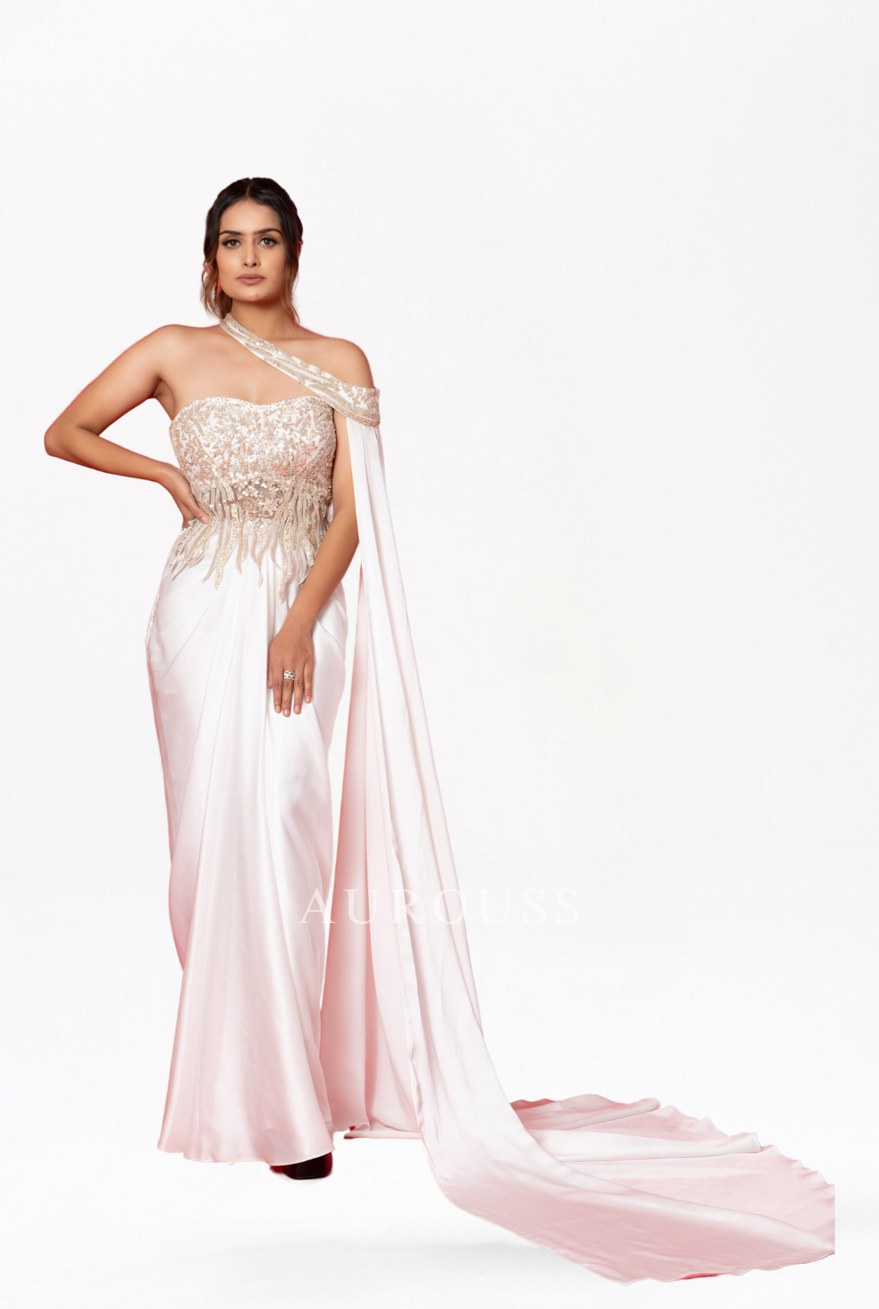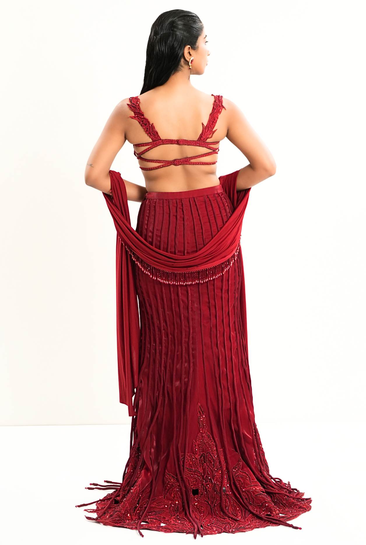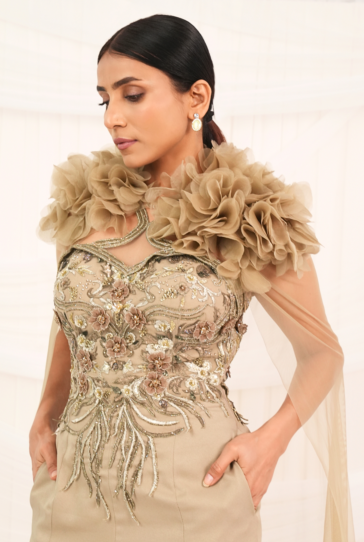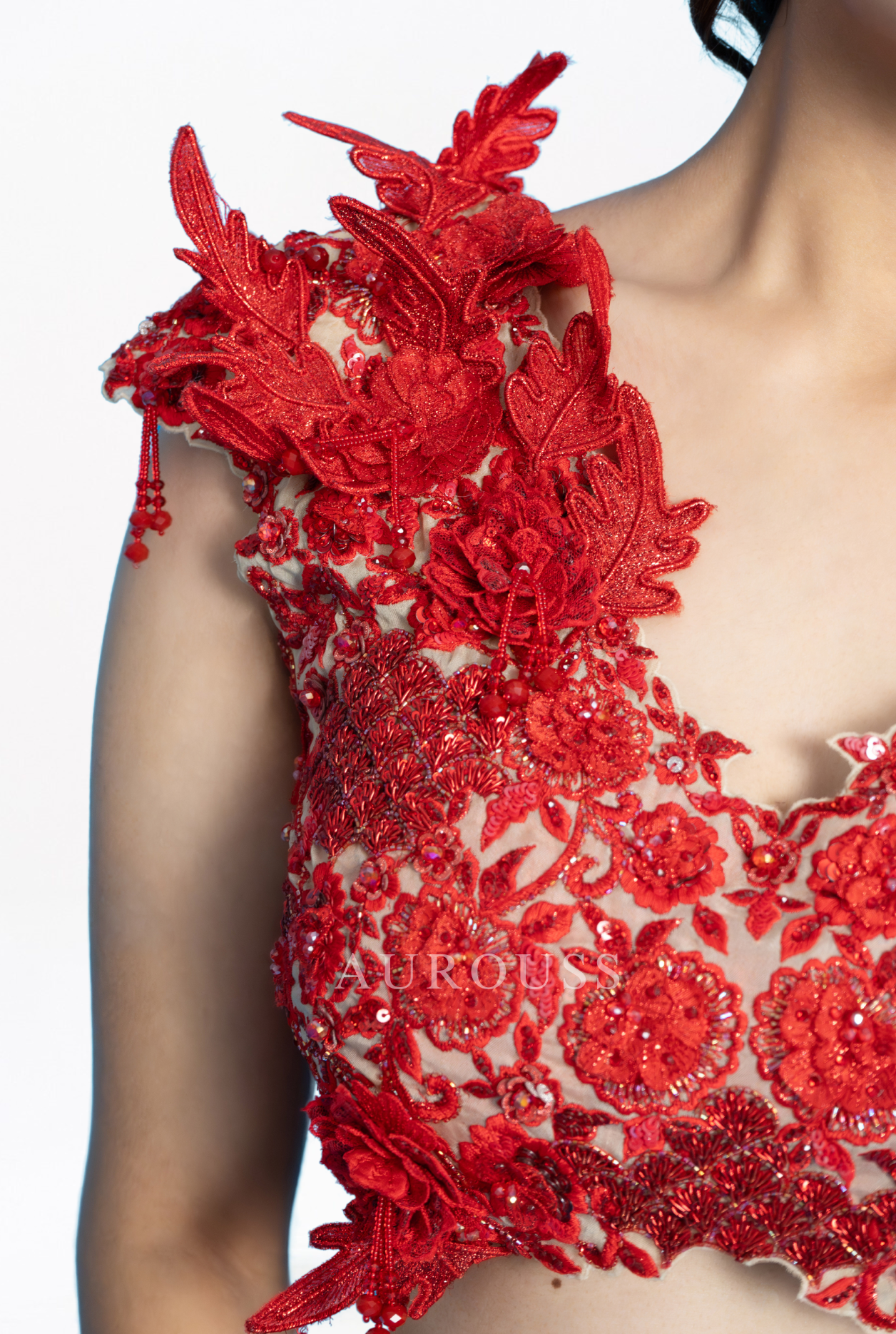 Submerged in the captivating beauty of deep red garnet, this gown is pure poetry in motion. It commands attention with its sleek mermaid silhouette and mesmerizes with a truly unique Rose-Shaped Cape.