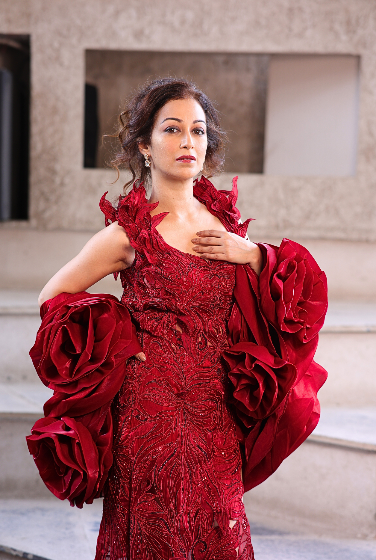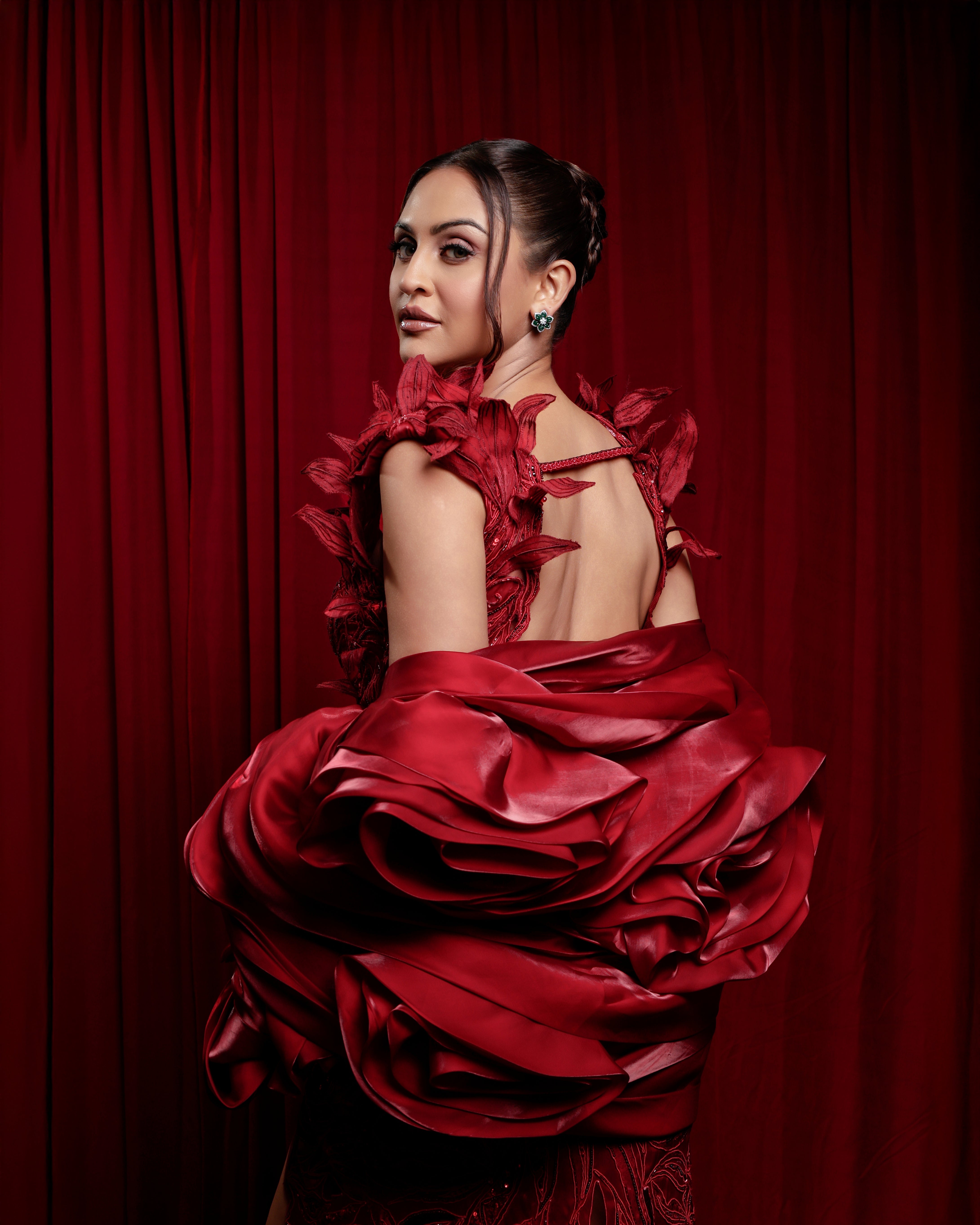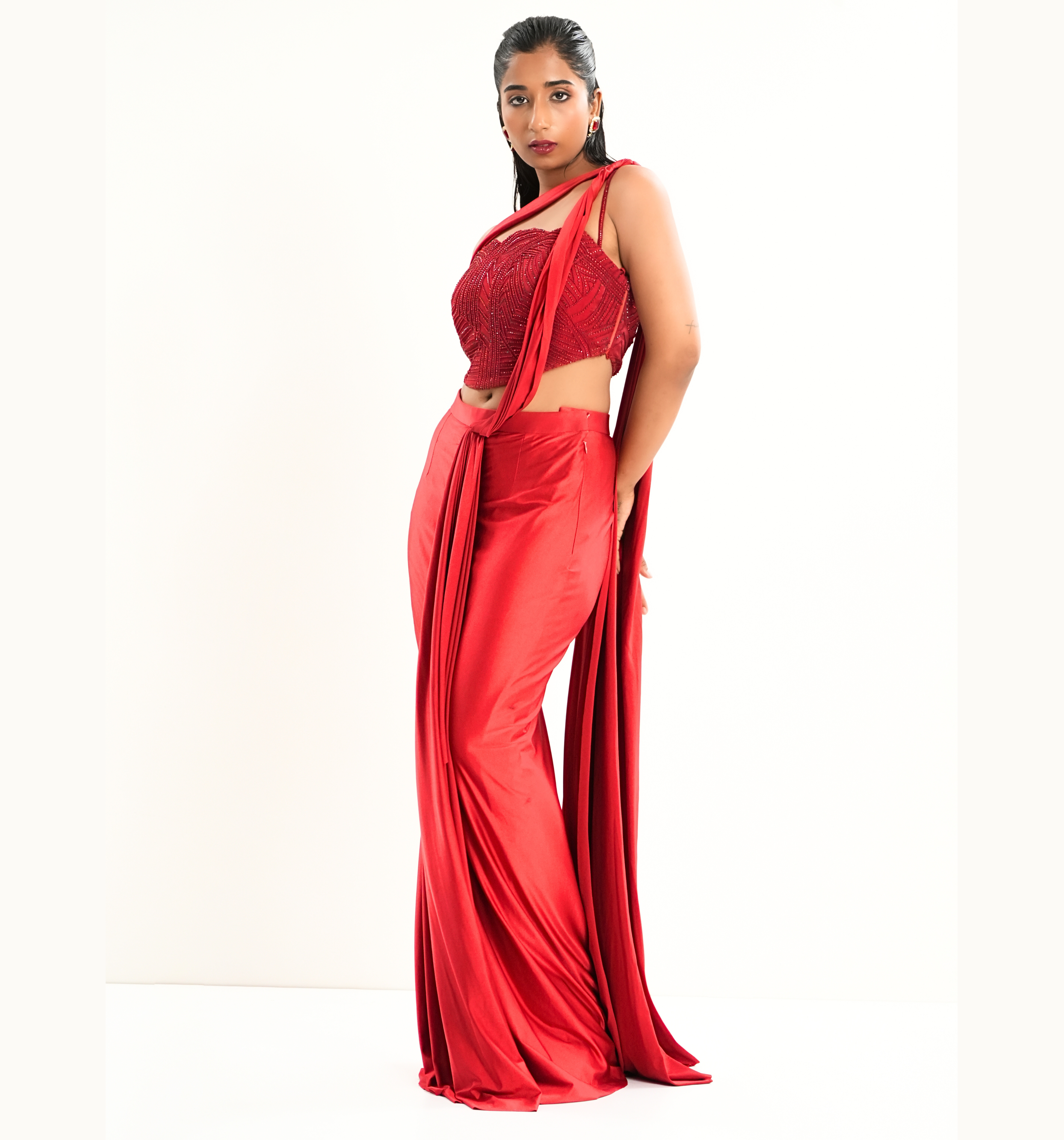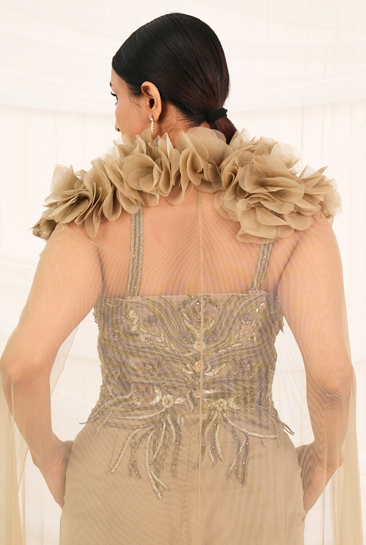 Submerged in the captivating beauty of deep red garnet, this gown is pure poetry in motion. It commands attention with its sleek mermaid silhouette and mesmerizes with a truly unique Rose-Shaped Cape.