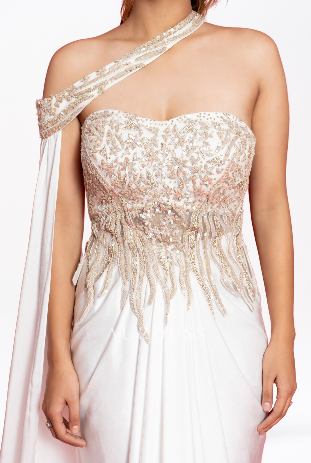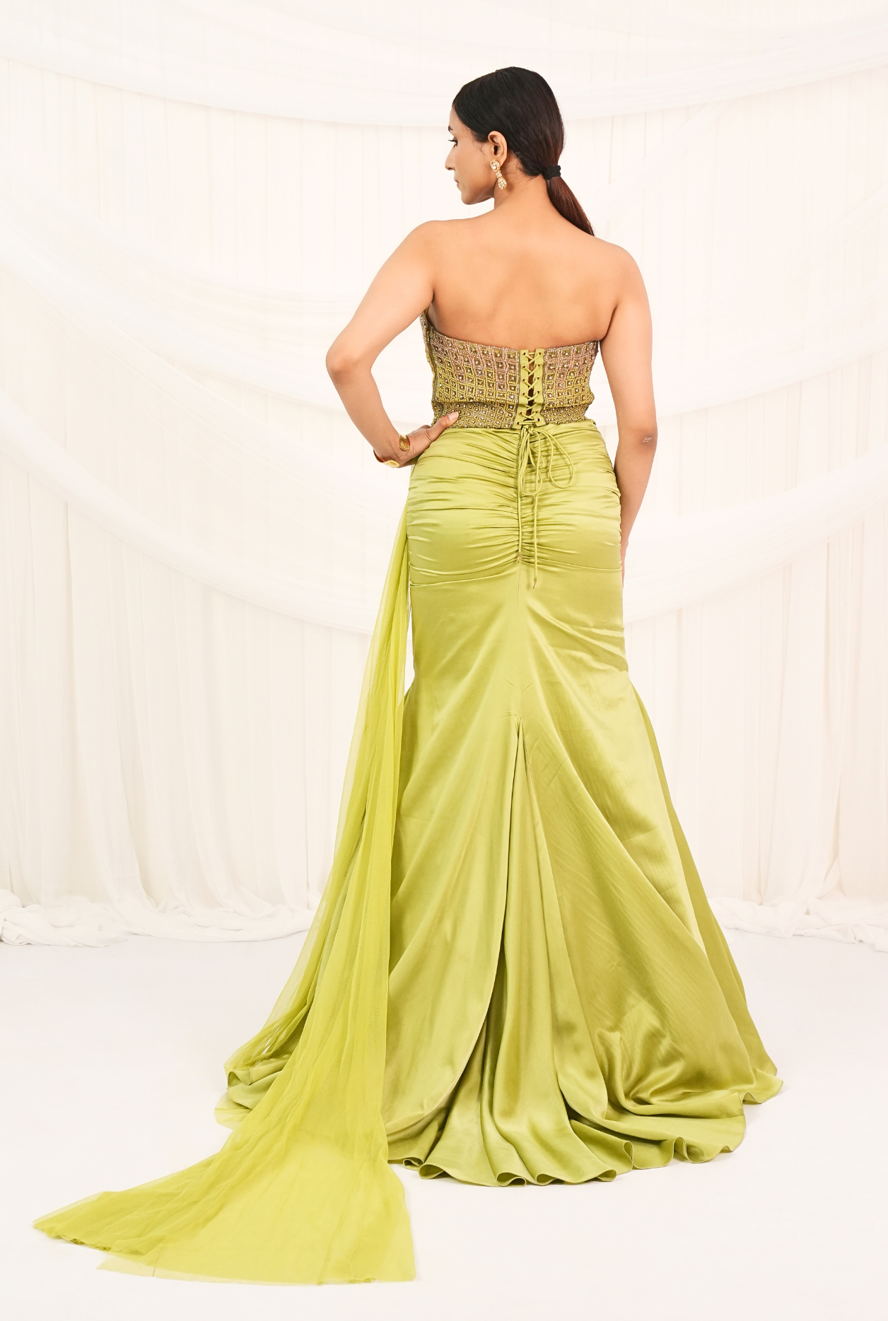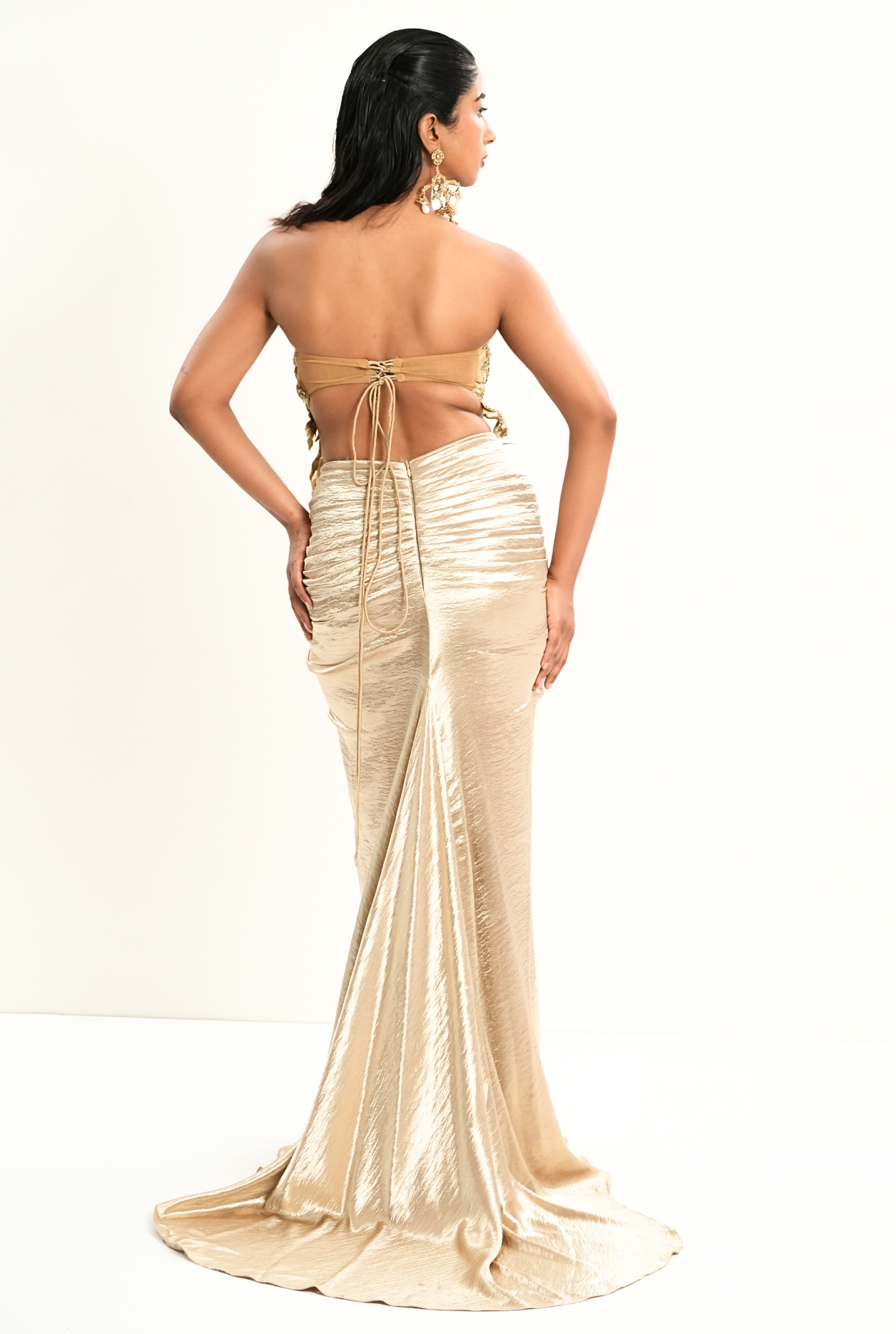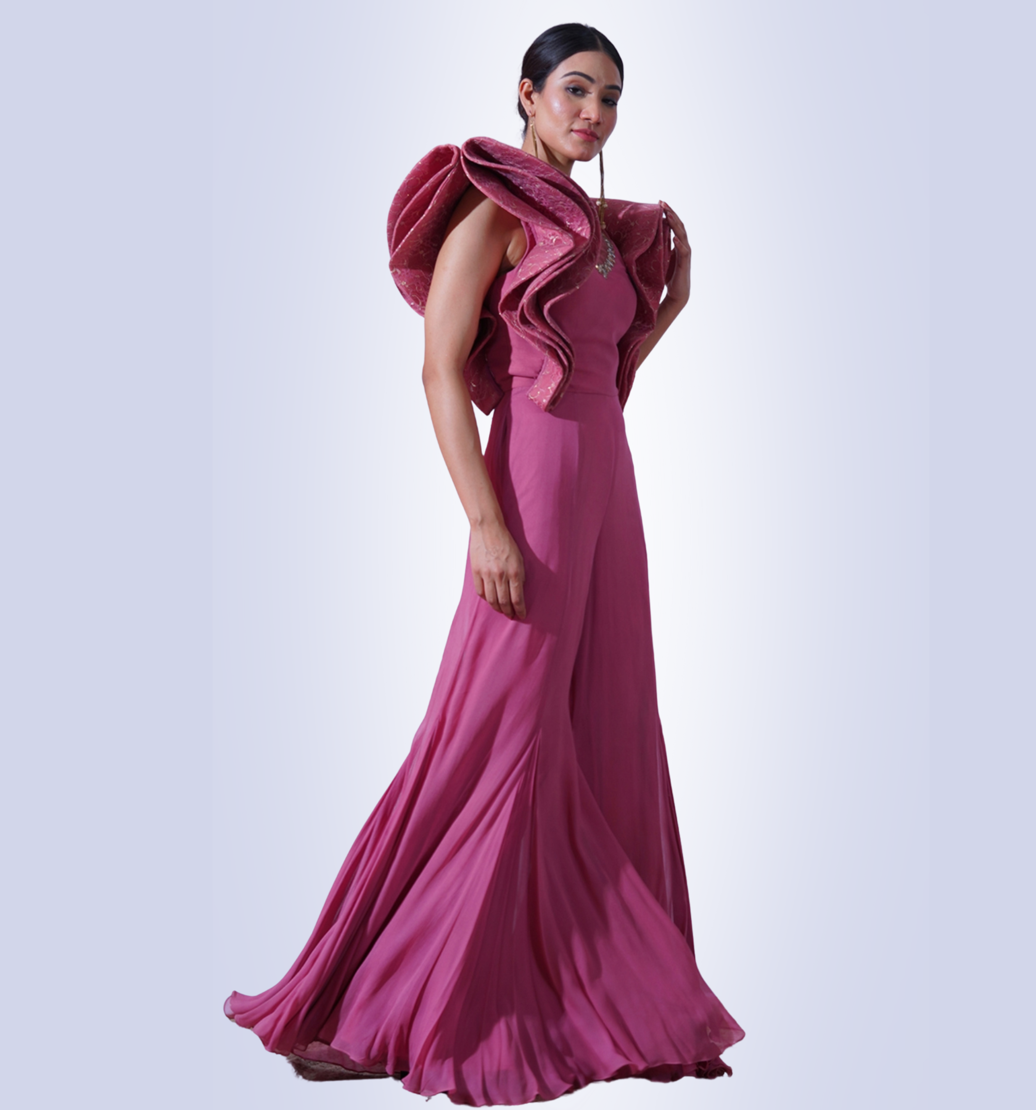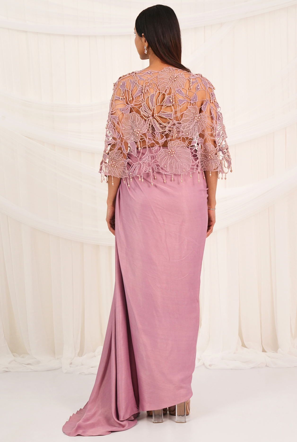 Submerged in the captivating beauty of deep red garnet, this gown is pure poetry in motion. It commands attention with its sleek mermaid silhouette and mesmerizes with a truly unique Rose-Shaped Cape.