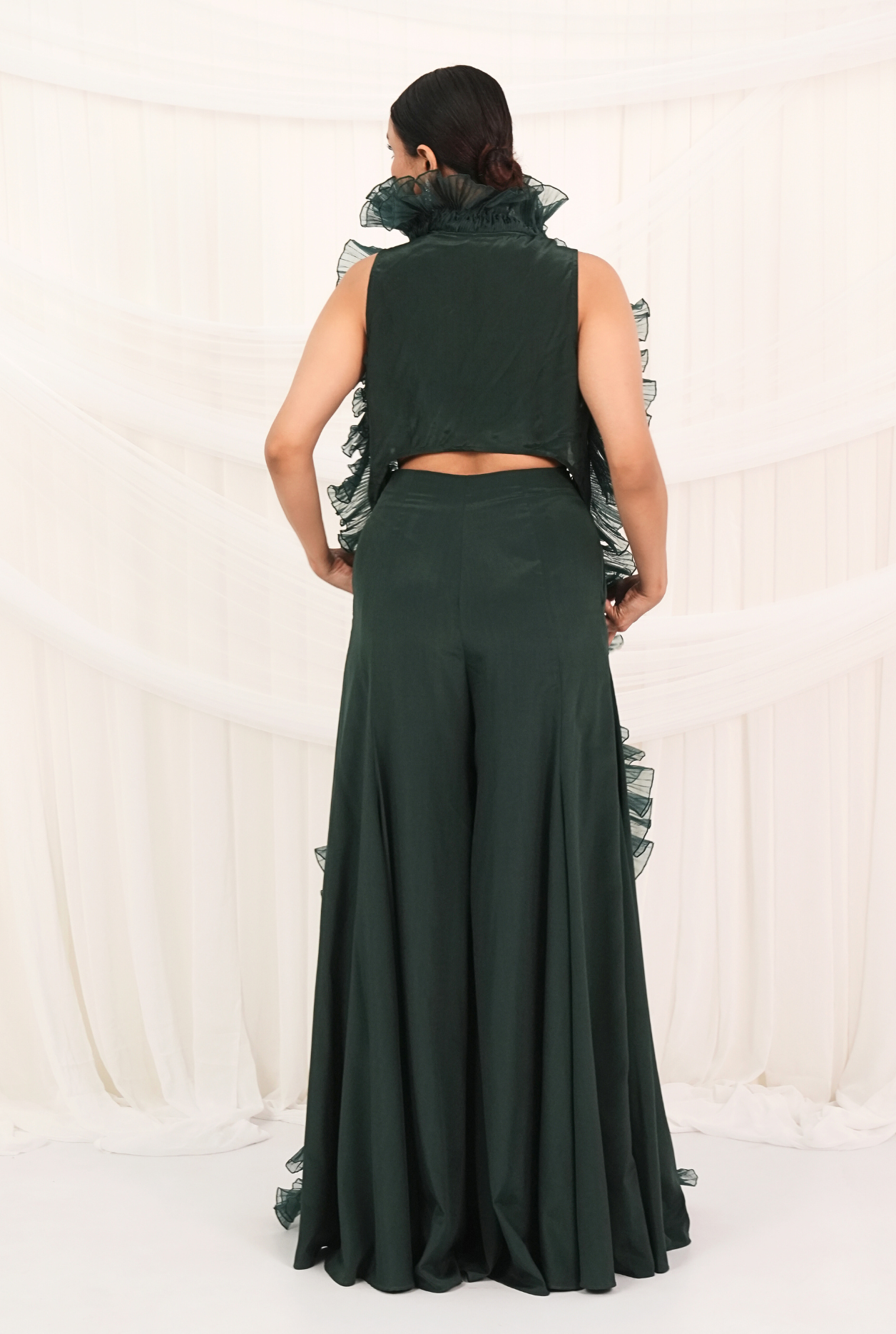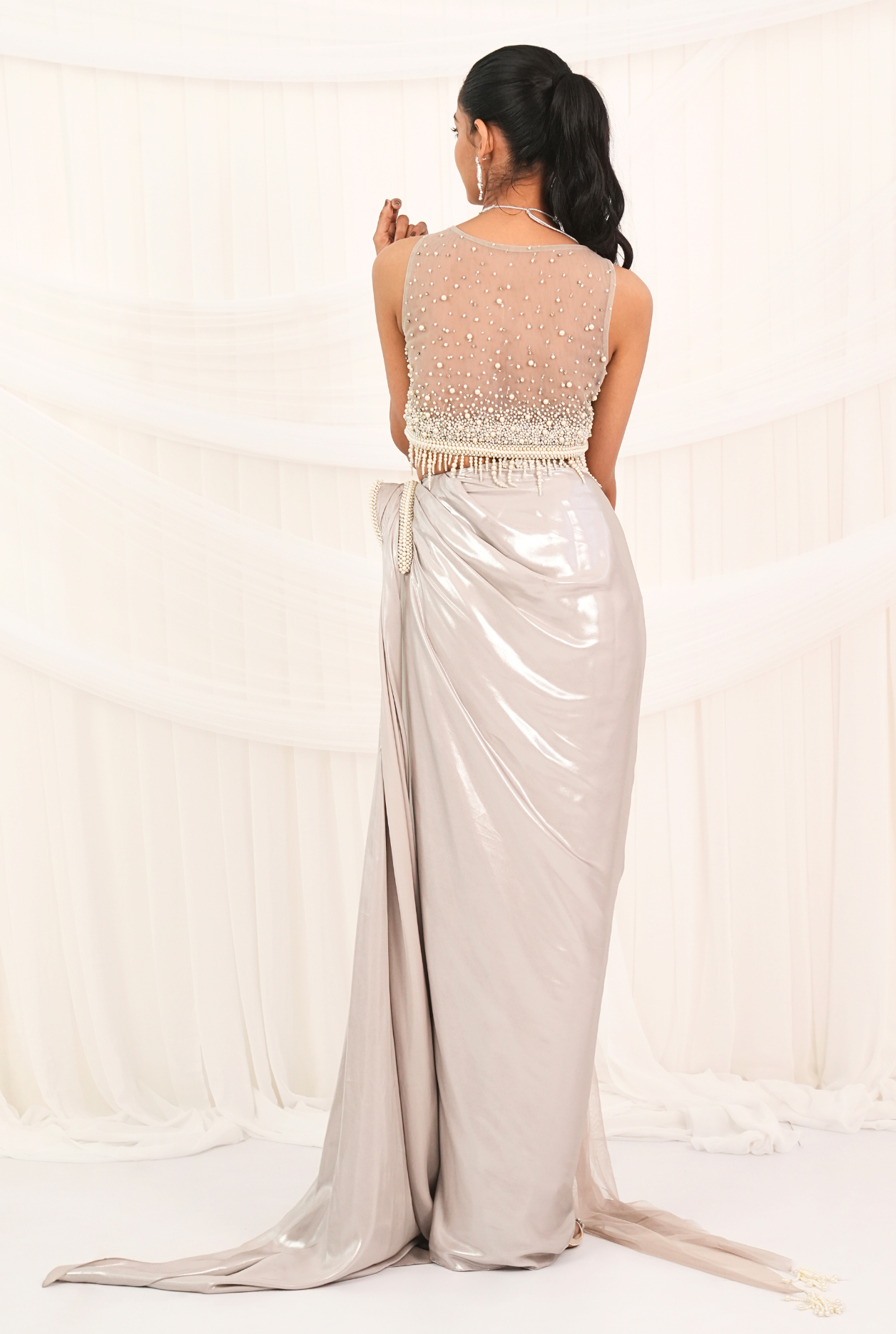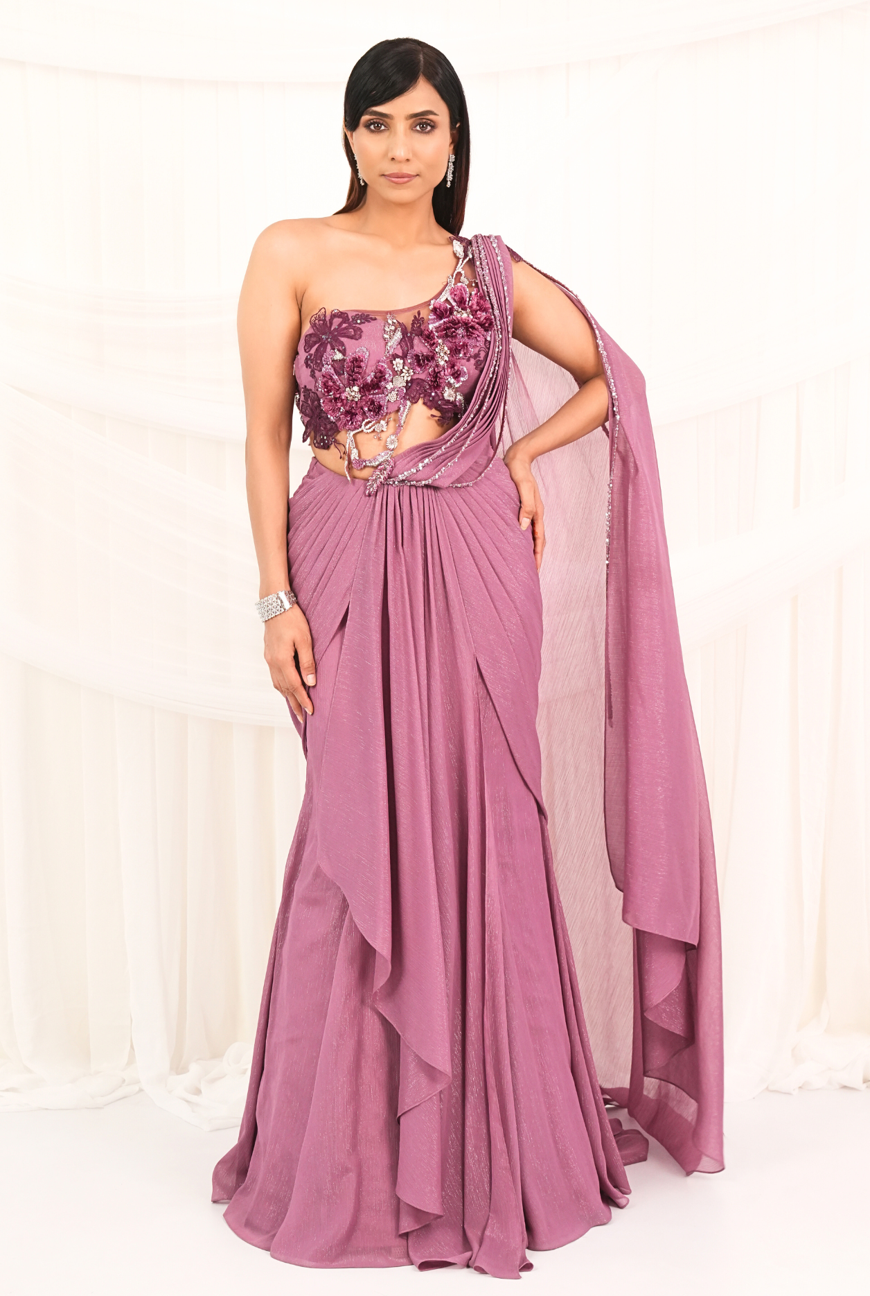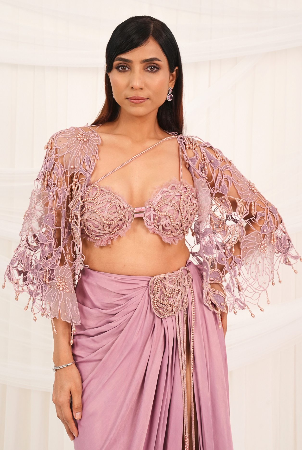 Submerged in the captivating beauty of deep red garnet, this gown is pure poetry in motion. It commands attention with its sleek mermaid silhouette and mesmerizes with a truly unique Rose-Shaped Cape.