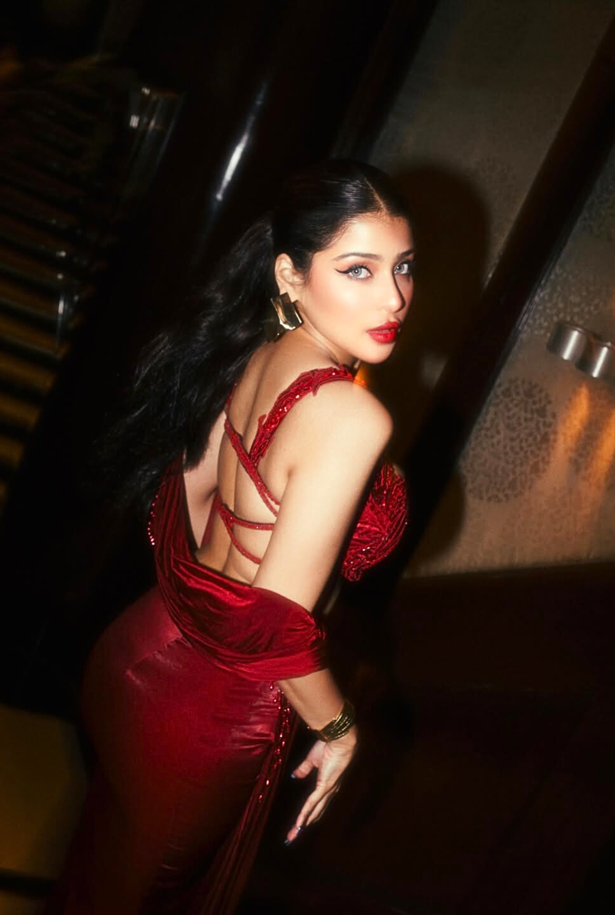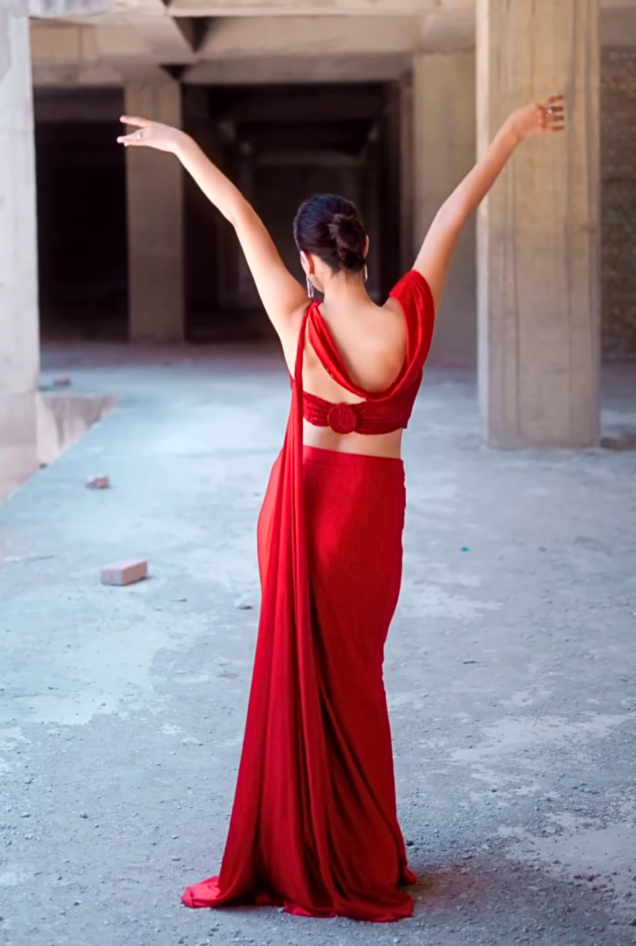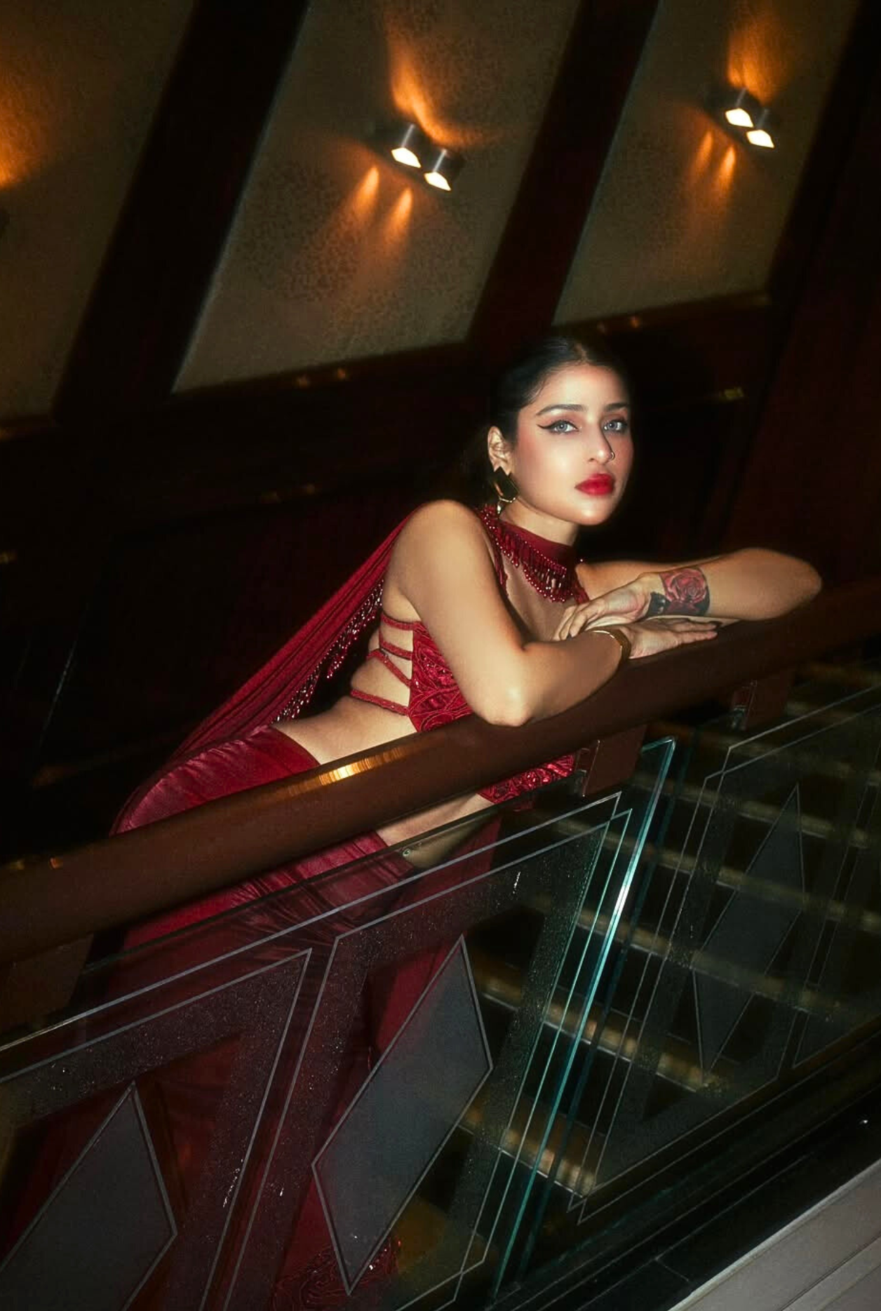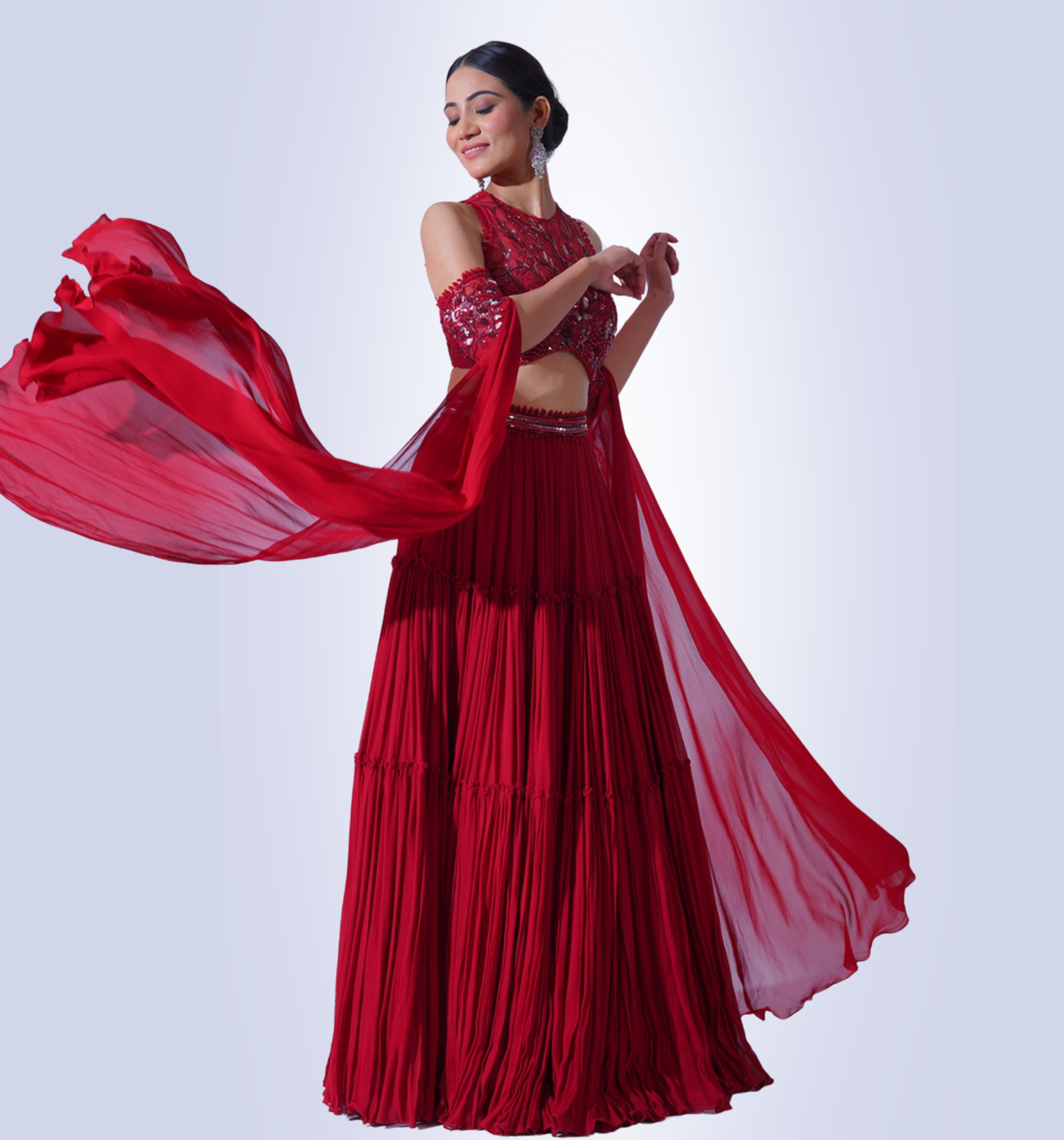 The craftsmanship is unparalleled: a rich tapestry of intricate patchwork, fine dori, and elegant cutwork, brought to life by the brilliant sparkle of hand-embroidered red crystals, cutdana, and sequins.