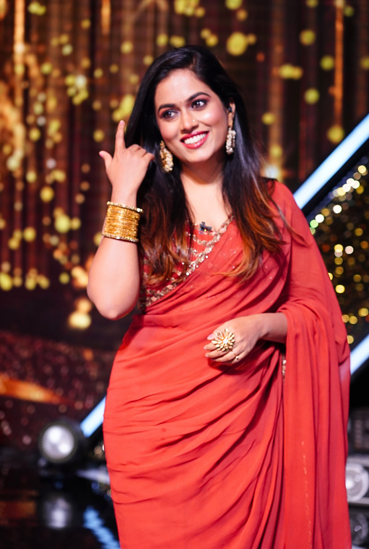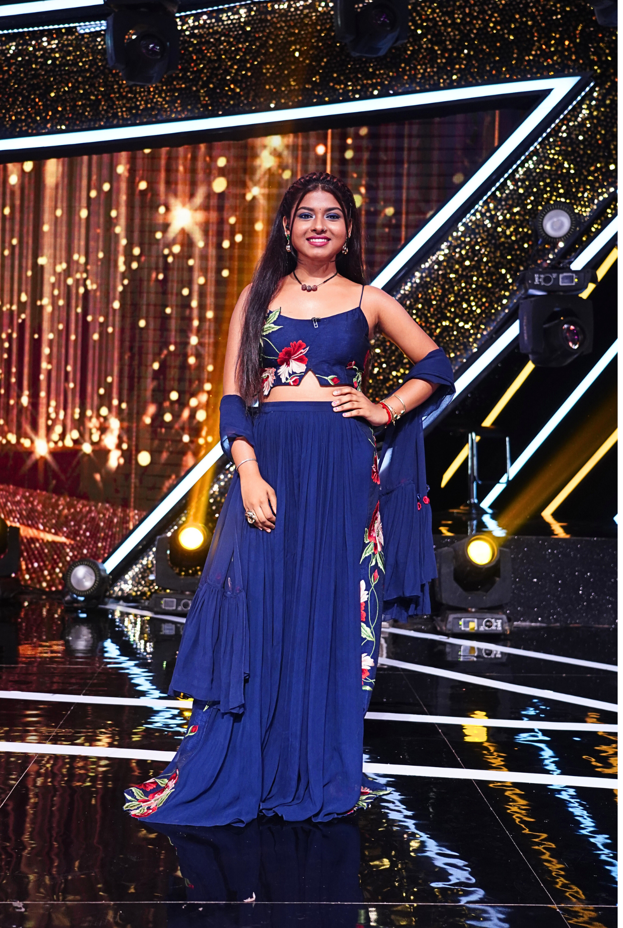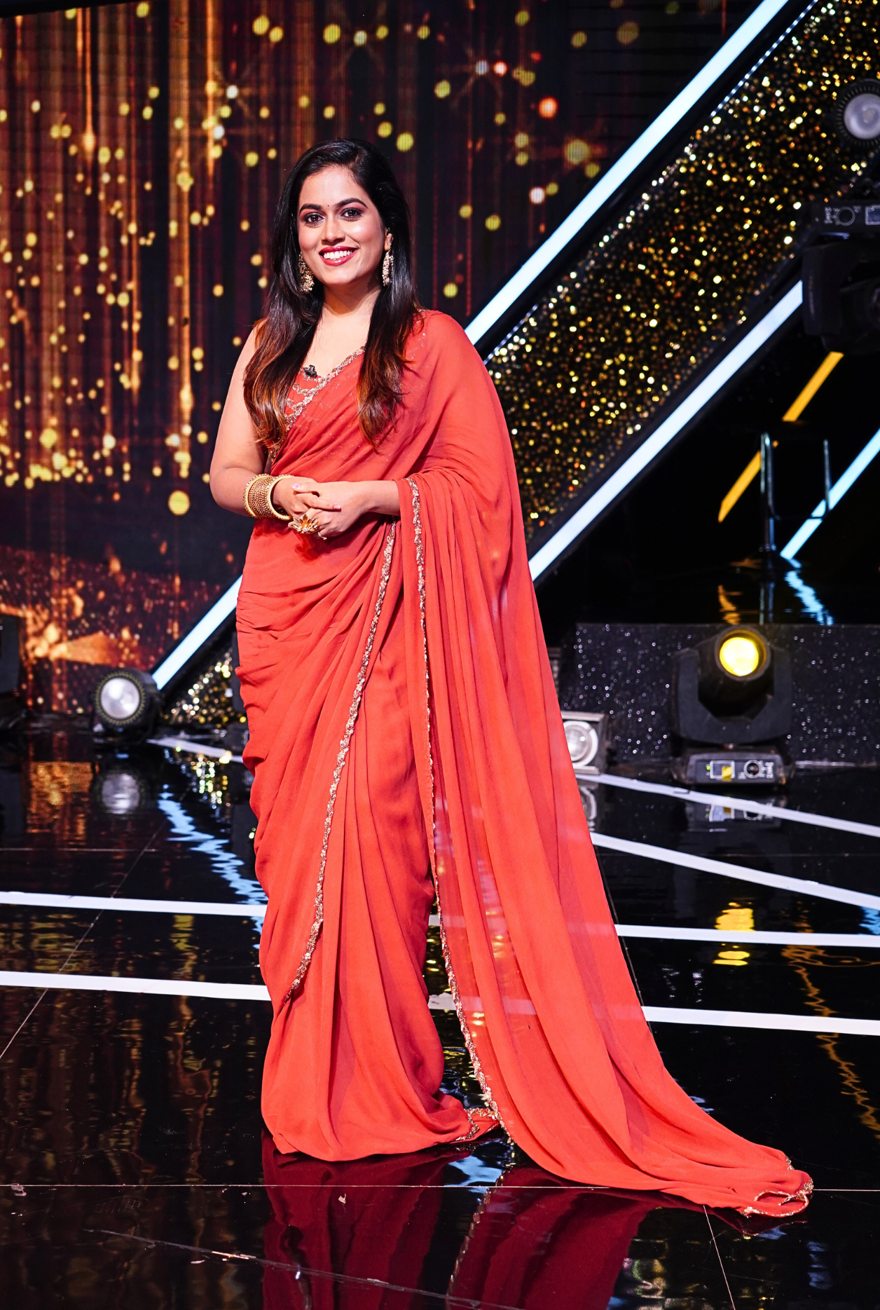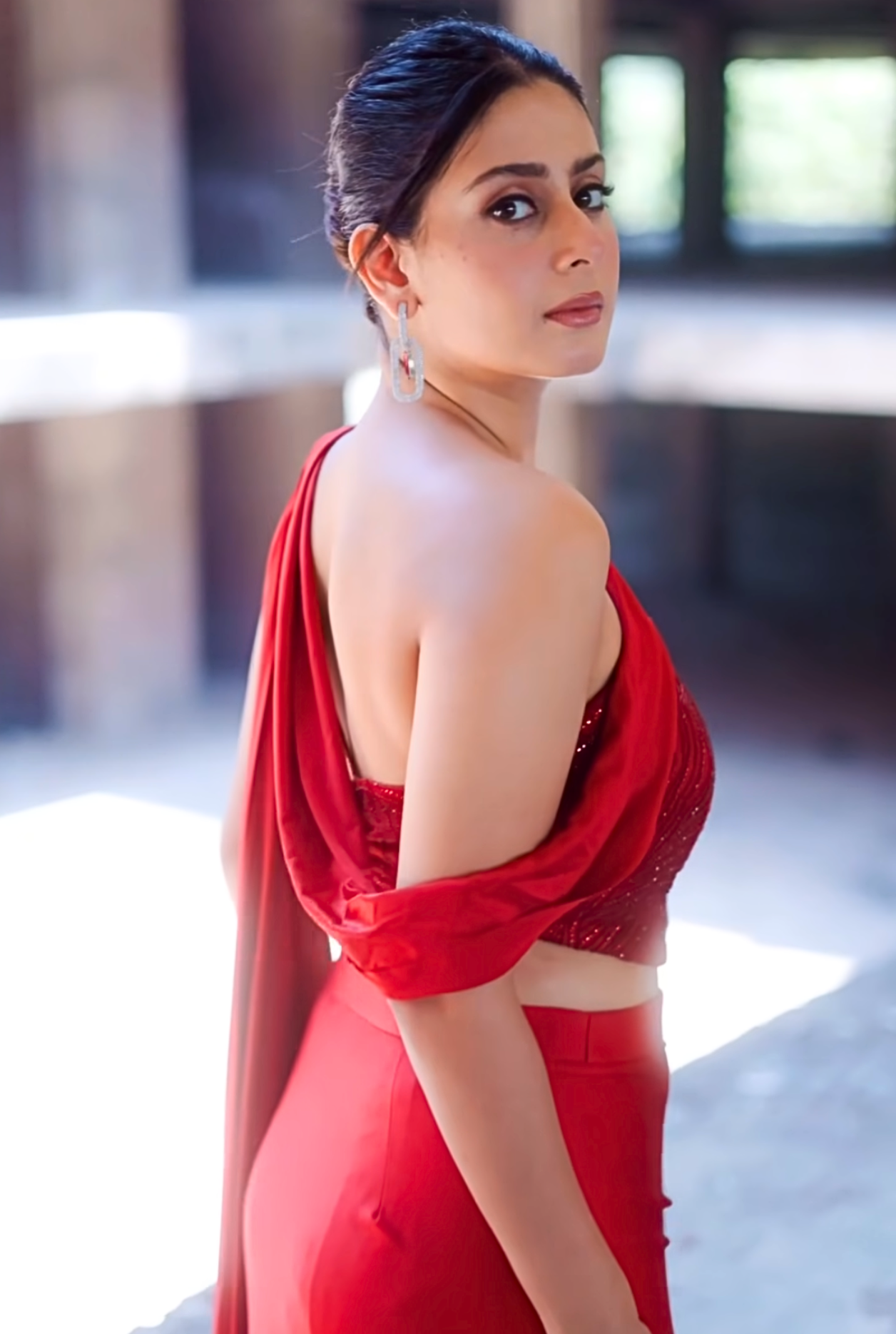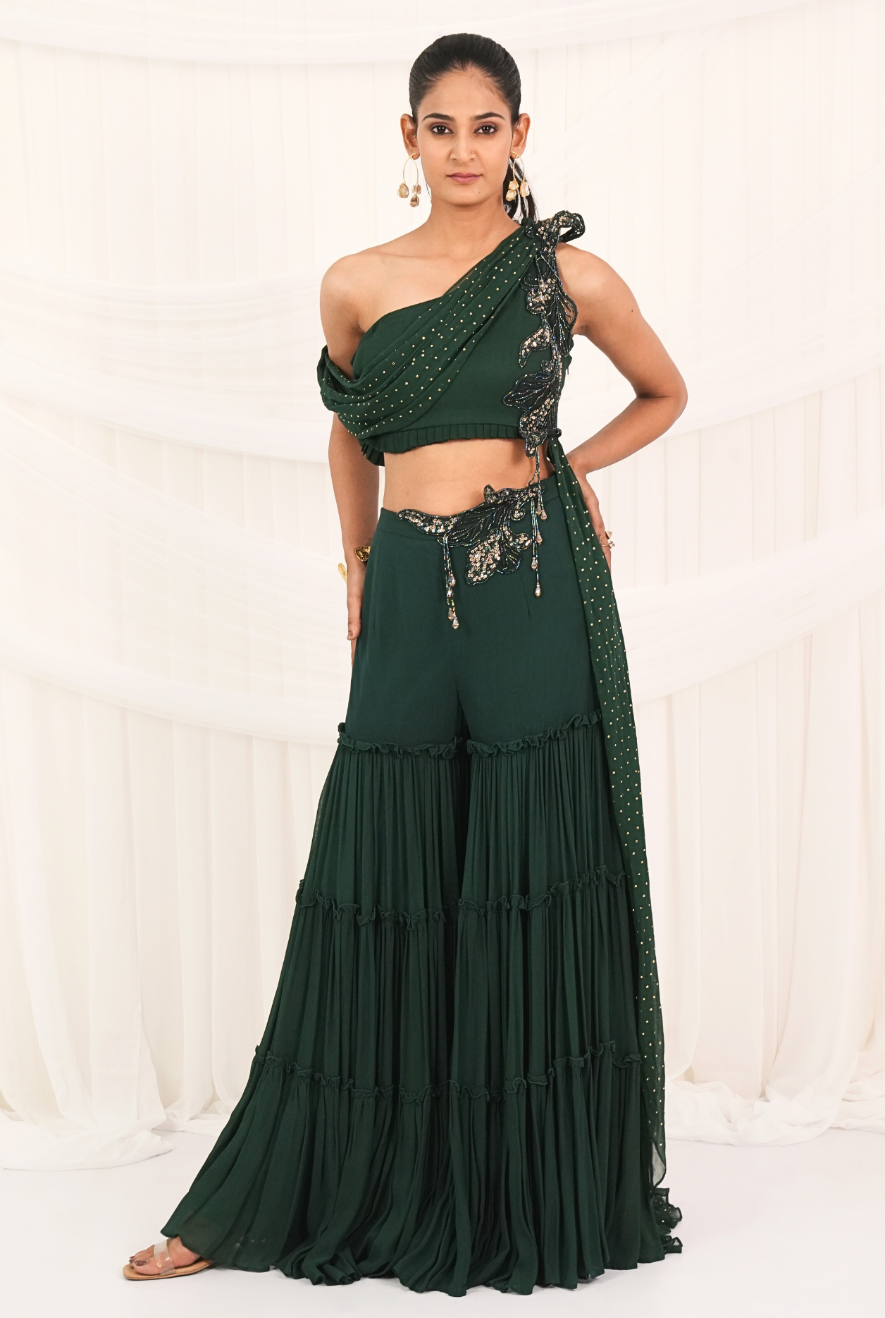 The craftsmanship is unparalleled: a rich tapestry of intricate patchwork, fine dori, and elegant cutwork, brought to life by the brilliant sparkle of hand-embroidered red crystals, cutdana, and sequins.