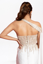Beautifully handcrafted ivory corset adorned with gold sequins, cutdana, and crystals. Paired effortlessly with a fine satin draped saree, it exudes elegance. The shoulder-detachable drape adds charm to the silhouette, making it perfect for weddings or formal events where style meets sophistication.