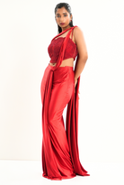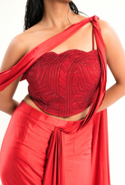This stunning red lycra saree is designed to flatter with its slimming silhouette and elegant two-side drapes. Paired with a dazzling bustier embellished with Swarovski crystals and glass pearls, it’s the perfect fusion of tradition and glamour—ideal for making a bold, sophisticated statement at any celebration.