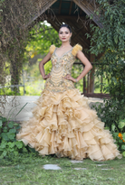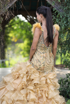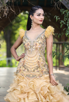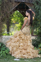 Unveil timeless glamour with our gold mermaid gown, featuring cascading organza frills and shimmering shades of golden hues. Adorned with delicate fringes, this masterpiece exudes grace and sophistication, perfect for making a statement at any event. Redefine luxury and captivate the spotlight effortlessly.