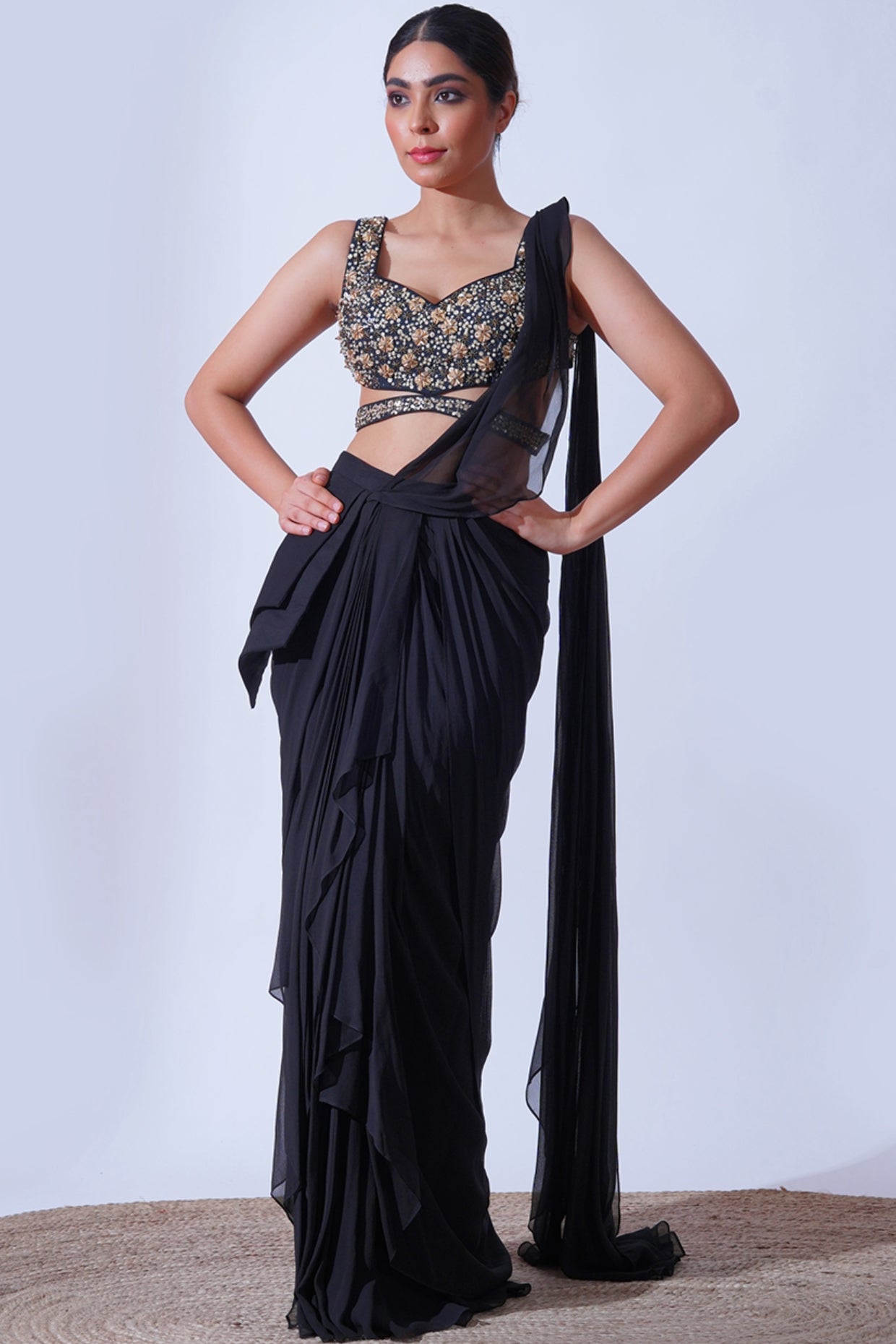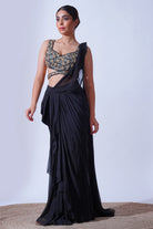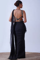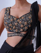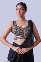 Elevate your elegance with our Black Pre-drapped Georgette Saree, adorned with a chic side paplum flap, gracefully paired with a golden-embroidery backless blouse. This exquisite ensemble effortlessly combines modern style with traditional grace. Embrace sophistication at every turn with this stunning saree ensemble.