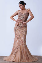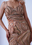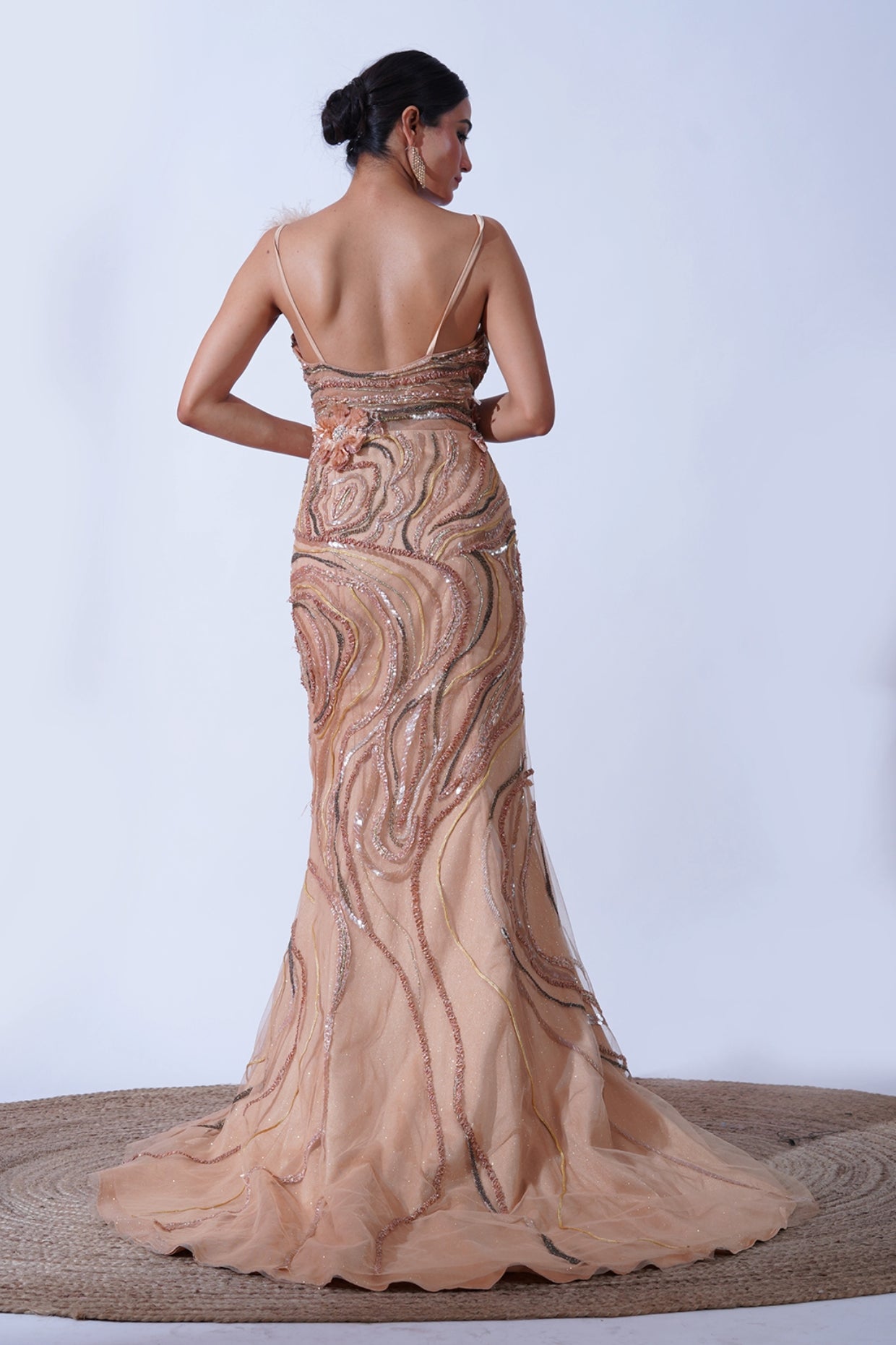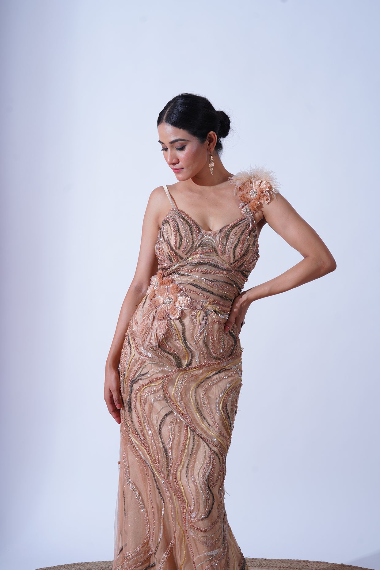 Dazzle in our Peach Mermaid Cut Gown, adorned with captivating line illusion embroidery crafted from rafia, sequins, and intricate 3D flowers with feathers. This ethereal ensemble exudes glamour and sophistication, making it the perfect choice for a memorable evening.