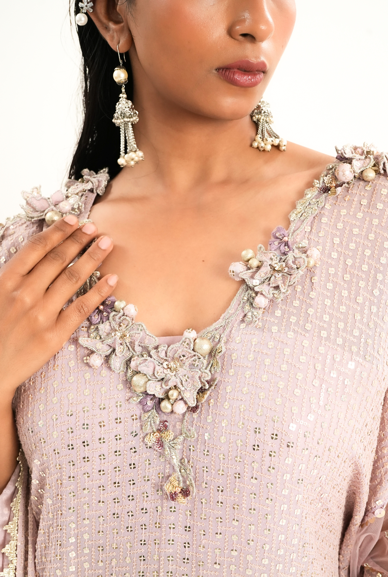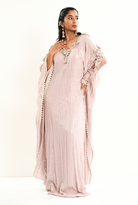Perfect for your summer celebrations, this breezy kaftan features an easy-fit silhouette in flowy, soft shimmery sequin georgette. Its unique pattern is elevated with exquisite 3D floral and leaf embroidery, adorned with delicate pearls—blending comfort with couture detail for an effortlessly elegant and exclusive festive look.