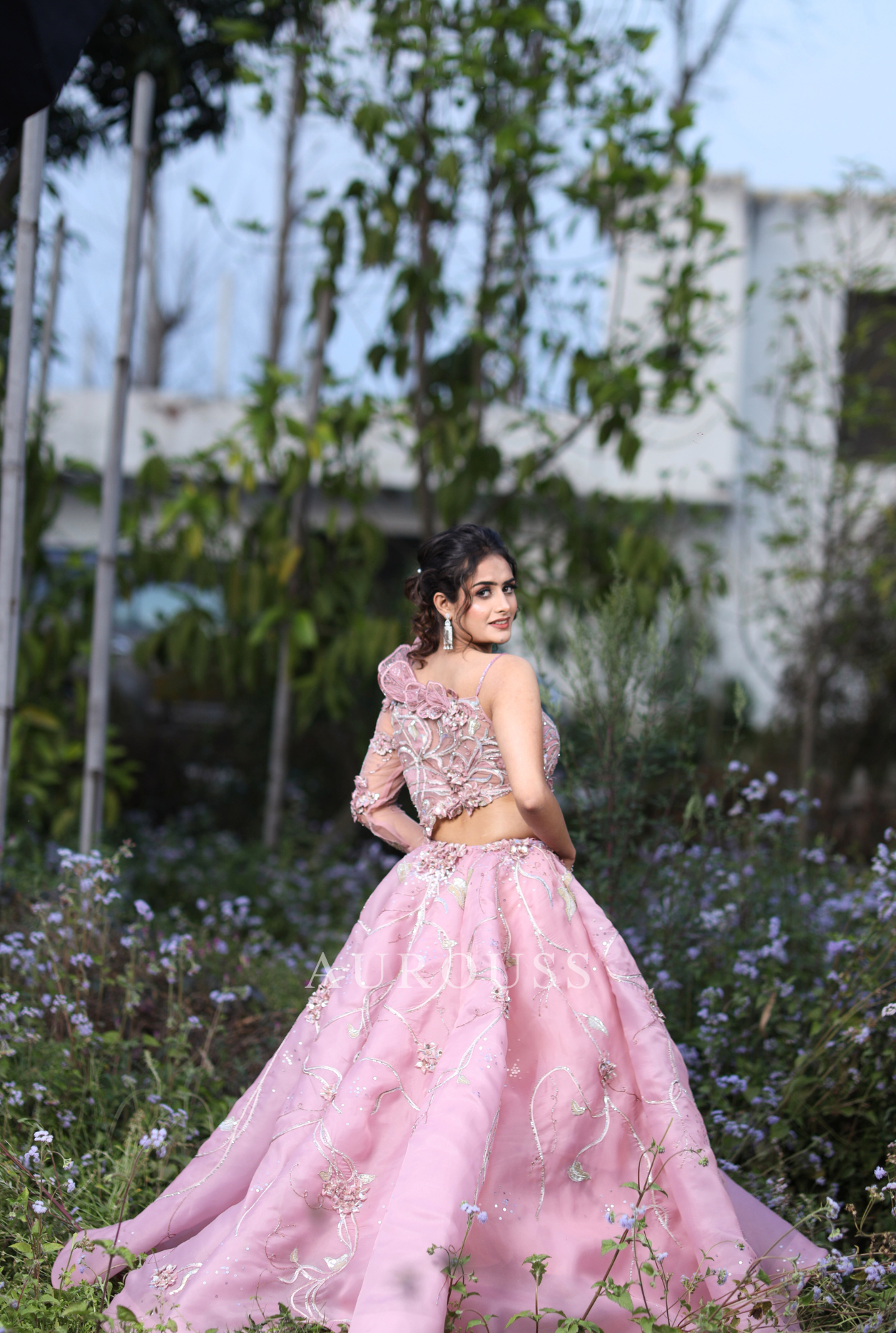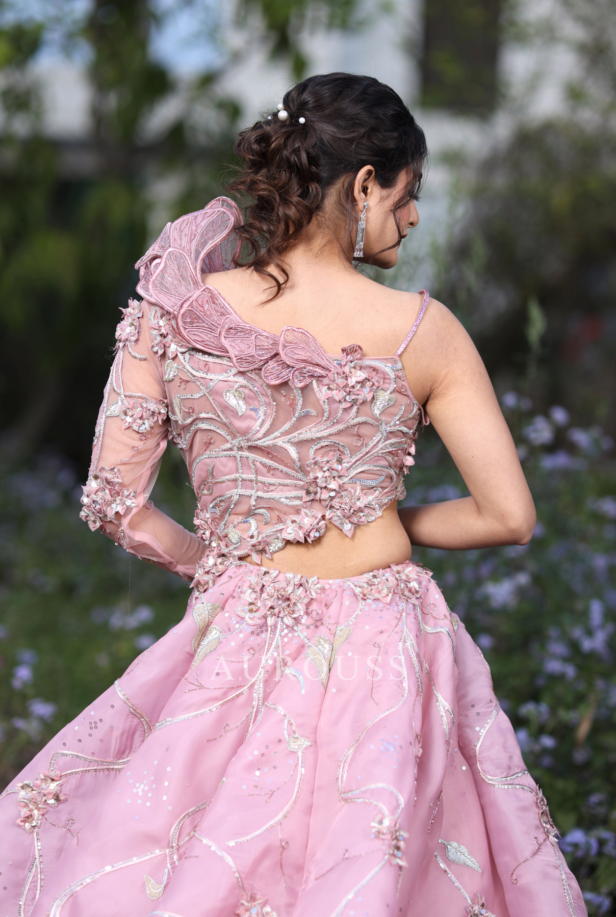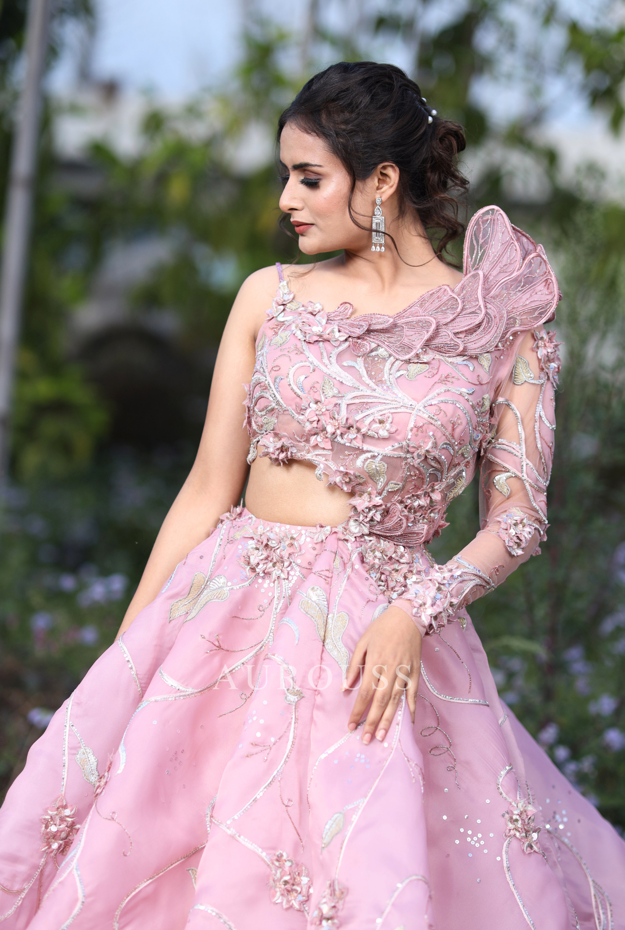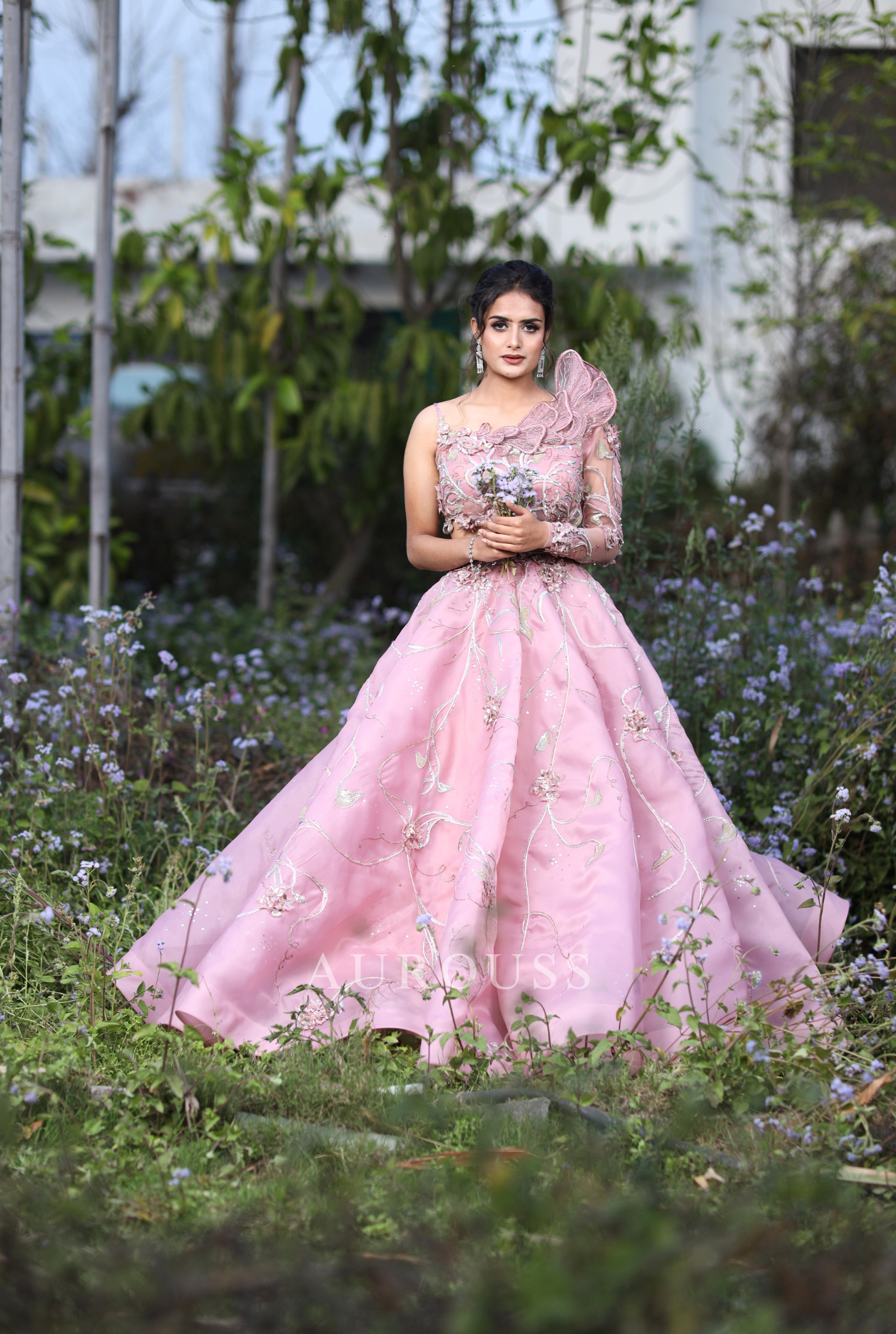 Grace the occasion in our pastel pink organza ball gown, featuring a one-shoulder neckline and a chic side cut. Adorned with intricate floral artwork and delicate 3D flowers, this exquisite design blends elegance and modernity, creating a mesmerizing look for your special moments.