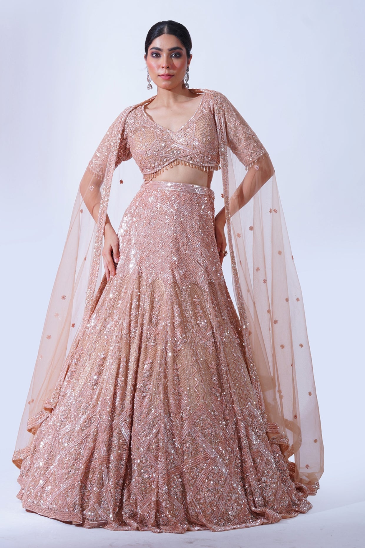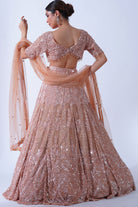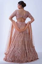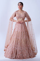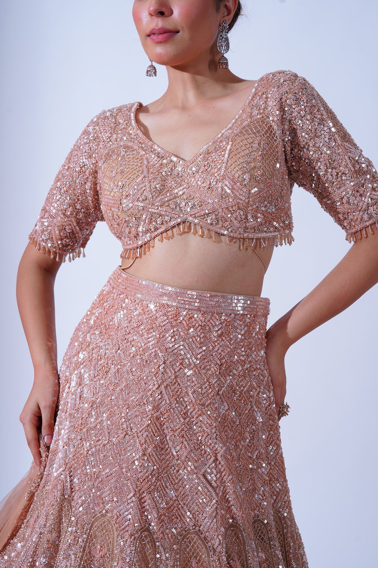 Step into elegance with our Peach Tonal Embroidered Kalidaar Lehenga, intricately adorned with crystals and pearls. Paired with an elbow-sleeve blouse featuring tassels and a border-buti embellished dupatta, this ensemble exudes timeless charm, perfect for a graceful and captivating presence at any celebration.