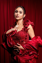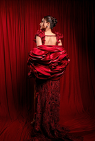 Drenched in deep red garnet, this sculpted mermaid gown is paired with a rose-shaped cape—an architectural flourish of romance. Intricate patchwork meets fine dori work and delicate cutwork, embroidered with shimmering red crystals, cutdana, and sequins. A poetic fusion of craftsmanship and couture, perfect for an unforgettable engagement or cocktail soirée.