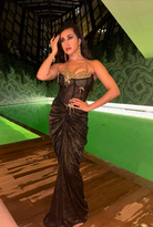 Elevate your look with this high-class black-gold blended corset, intricately embroidered with varied glass crystals, 3D petals, and floral motifs. Dramatic tassels add movement. Paired with a front-gathered foil satin skirt in a luxe finish, it’s a bold, sculpted silhouette perfect for a statement-making evening ensemble.