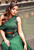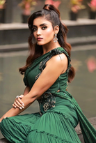 Flowy and elegant, this three-layer palazzo in soft georgette brings graceful movement to every step. Embellished with delicate waist embroidery and playful tassels, it’s paired with a uniquely designed dual-side draped top, adorned with intricate 3D embroidery and tassels—perfect for a chic, standout look at any special occasion.