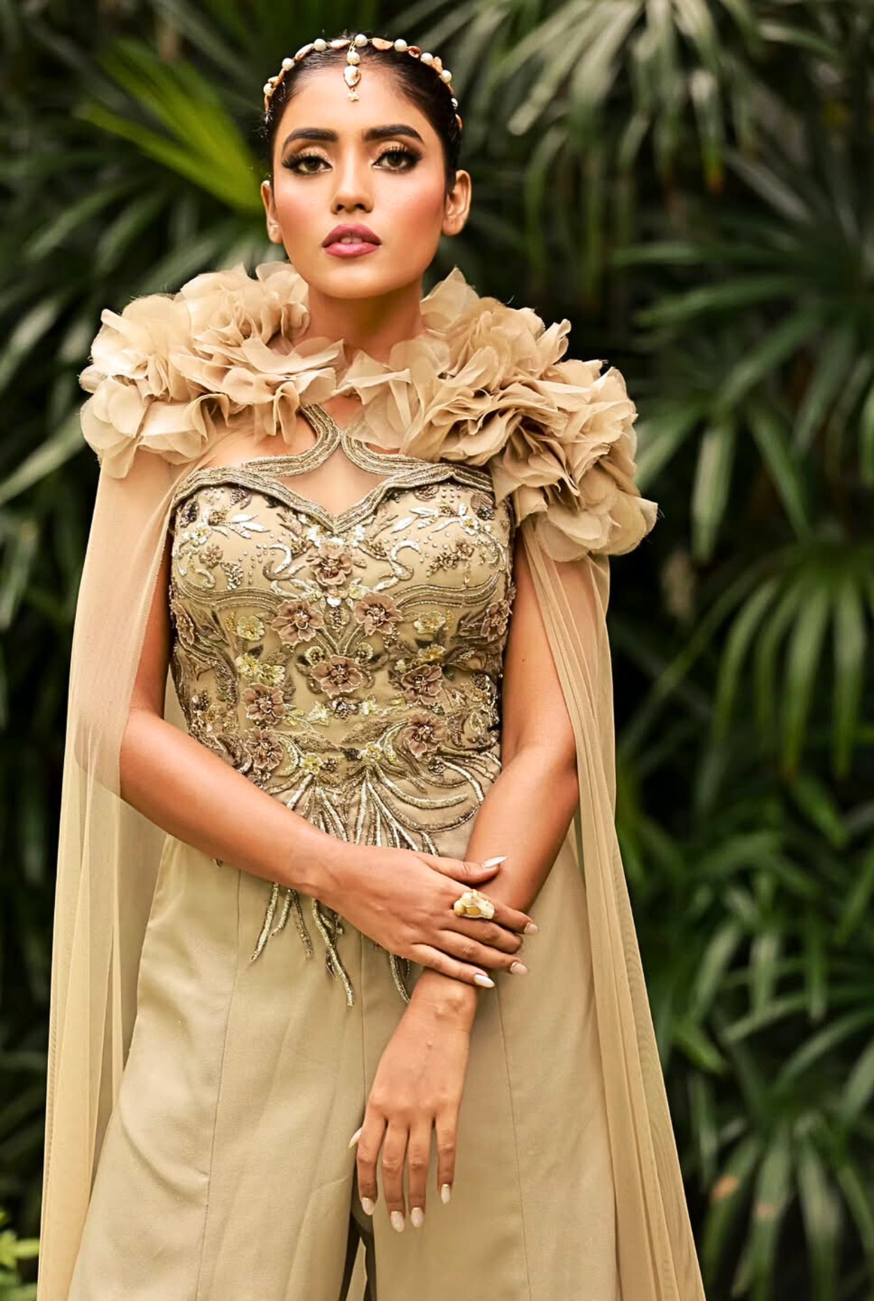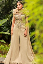 A perfect blend of comfort and couture, this flared-bottom jumpsuit features pockets and a fitted, embellished upper adorned with 3D flowers, crystals, and cutdana. The detachable cape, blooming with 3D floral details, adds drama and charm—making it an eye-catching ensemble for those who love elegance with ease.
