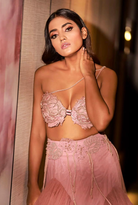 A bold high side-slit drape skirt with skin-fitted stockings adorned with pearl tassels adds striking drama. Paired with a modern jaali cape and a pearl-embellished statement bralette with cascading pearl strings, this look fuses elegance and allure—creating a couture fantasy designed for the fearless, modern-day queen.