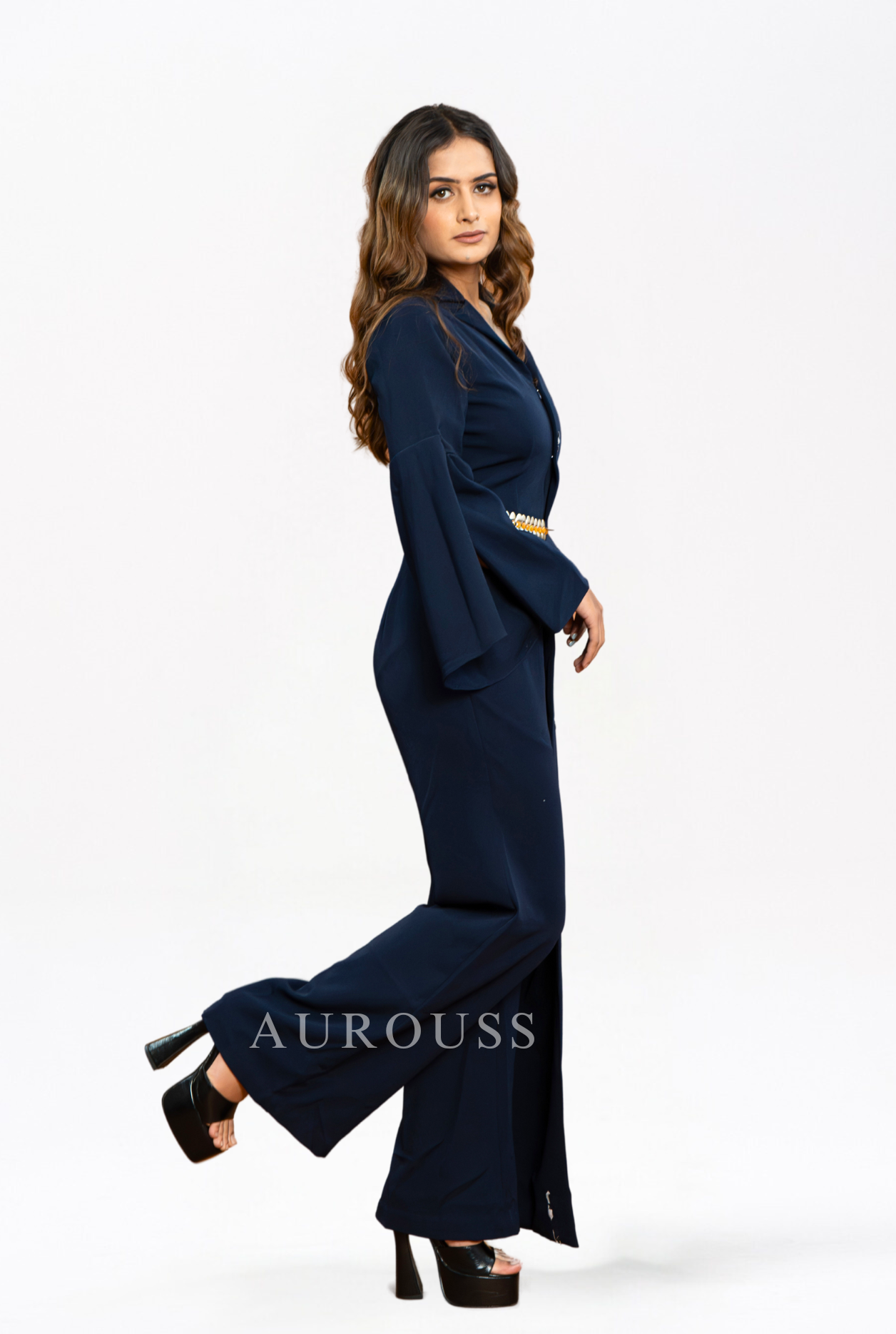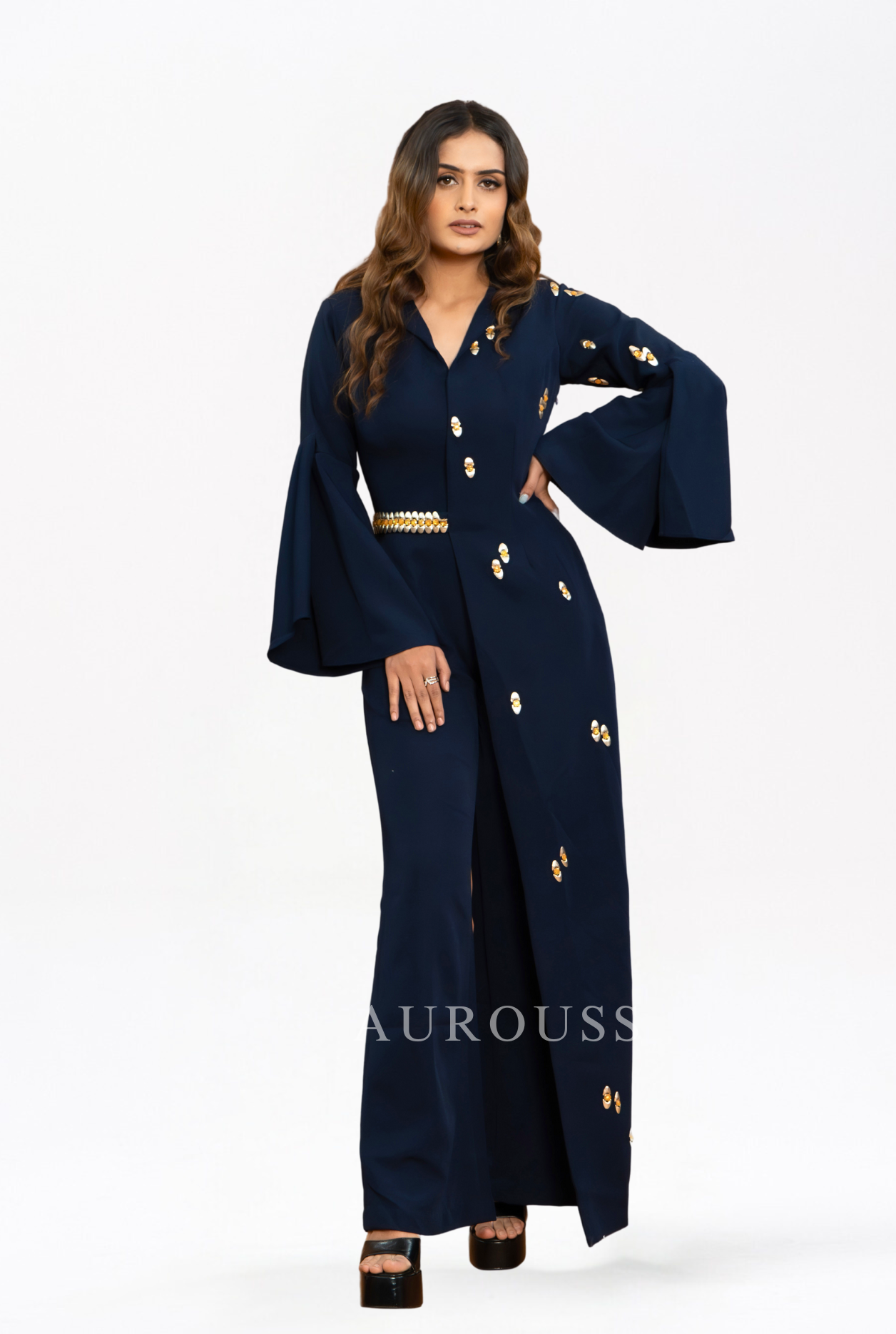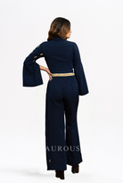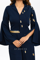 Blue One-Side Long Panel Jumpsuit, crafted from luxurious banana crepe fabric. This contemporary piece is elevated with exquisite Western embroidery, adorned with stones and studs for added glamour.
