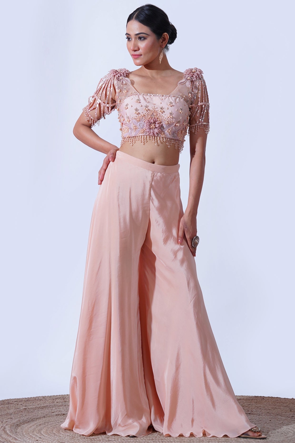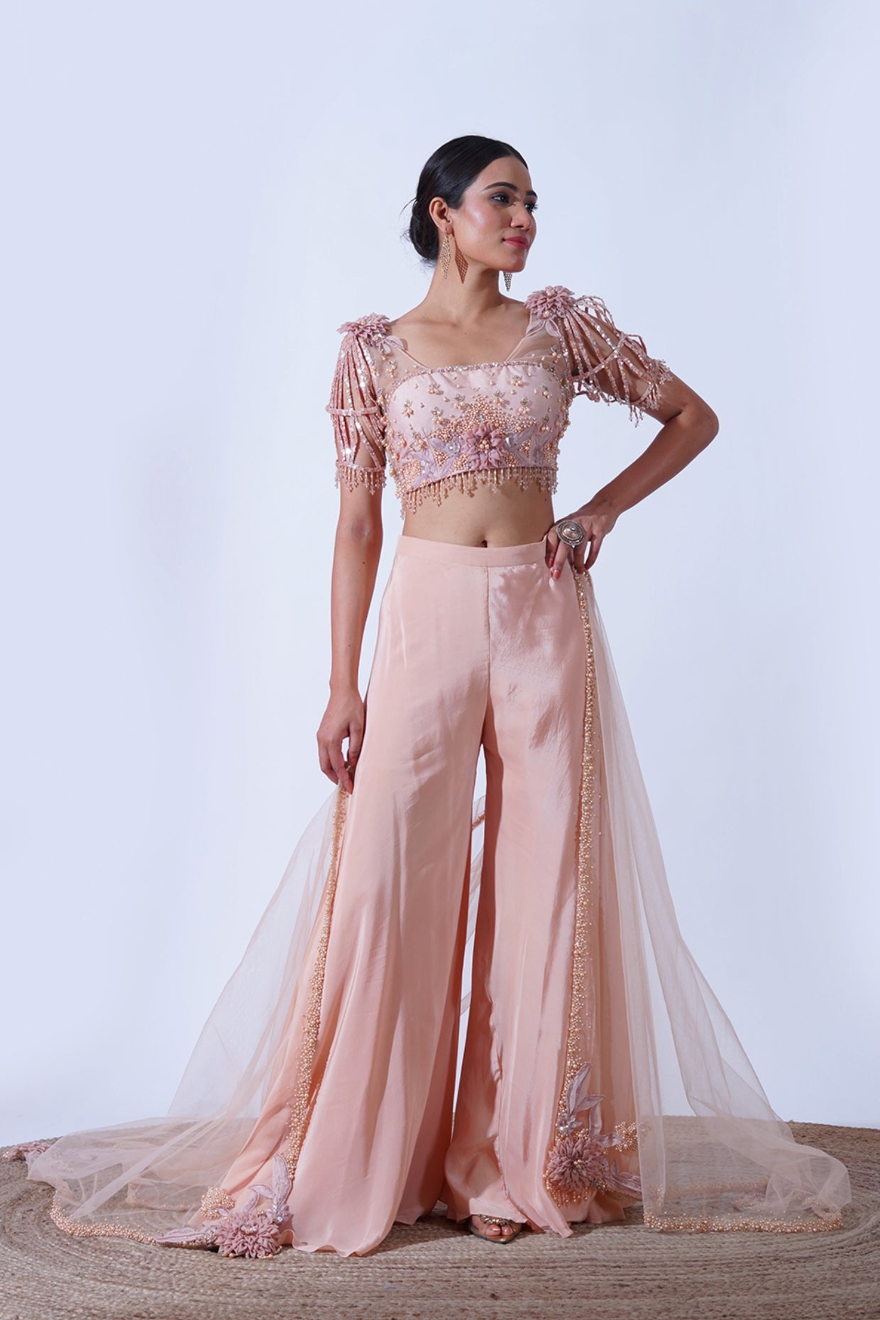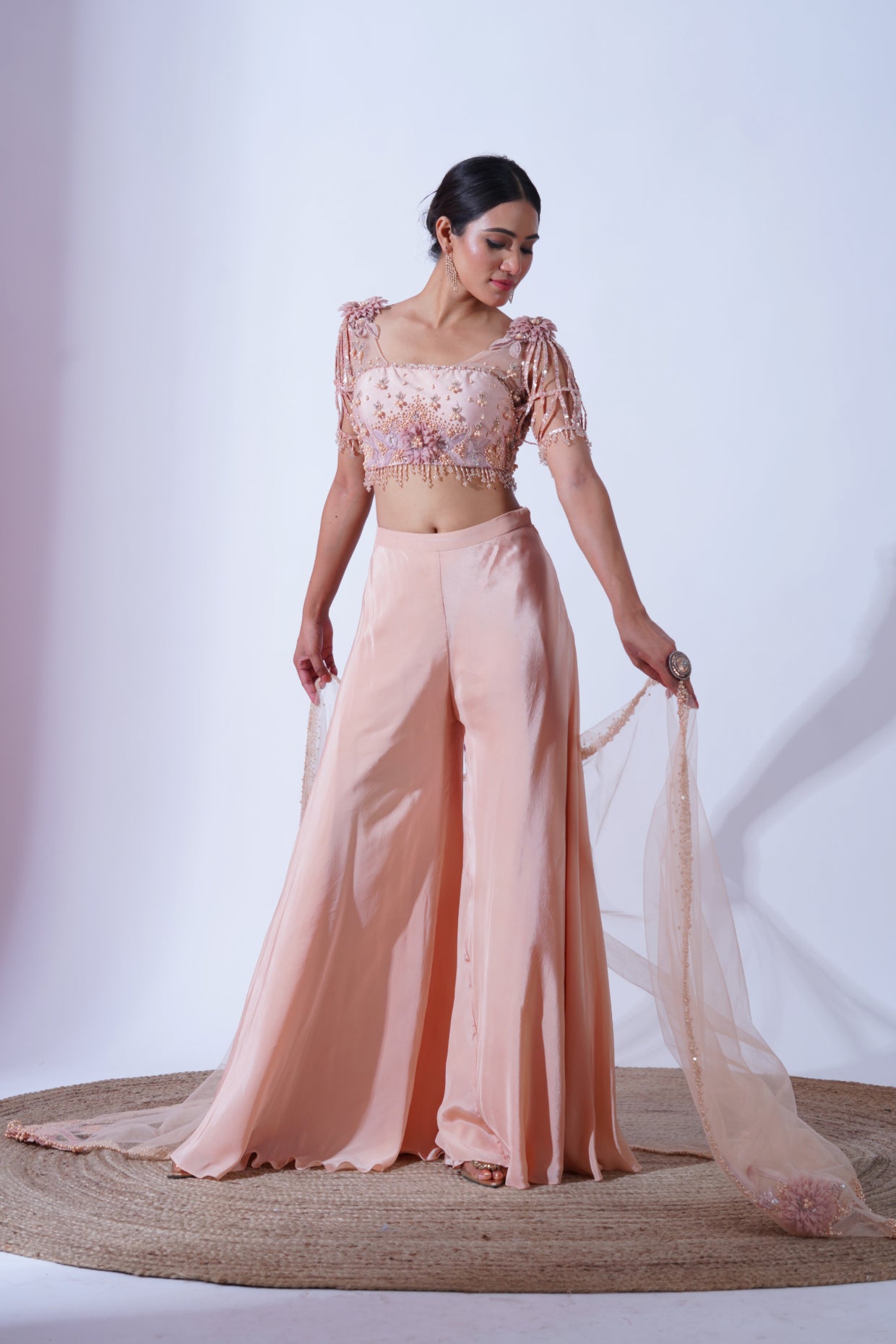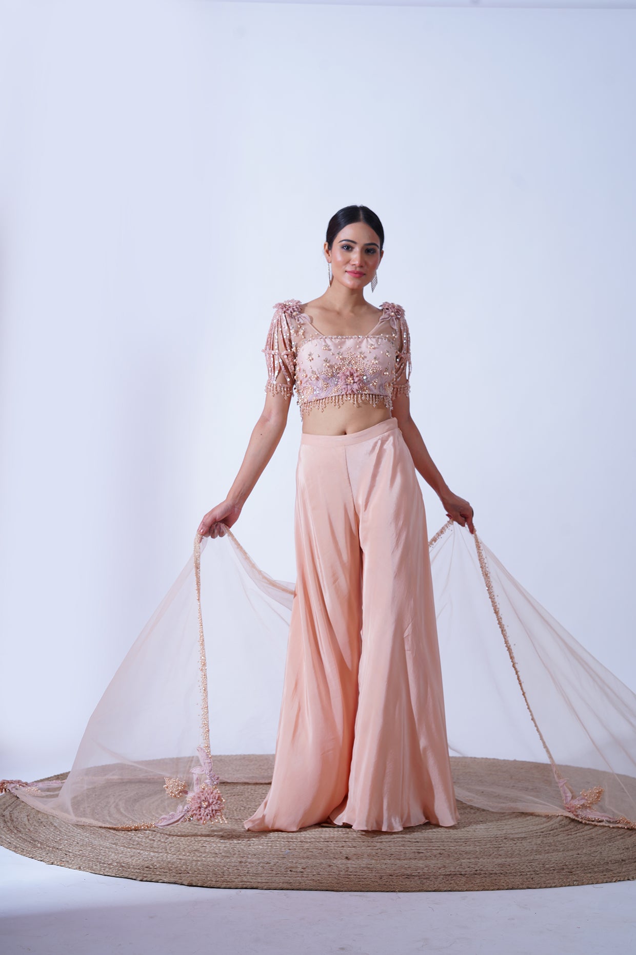 Embrace grace and sophistication with our Peach Crape Palazzo set, featuring a delicately embroidered blouse adorned with pearls and organza 3D flowers. Paired seamlessly with a border-embroidered tulle dupatta, this ensemble exudes timeless charm. Elevate your wardrobe with this ethereal combination, perfect for making a statement at any occasion.