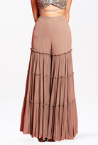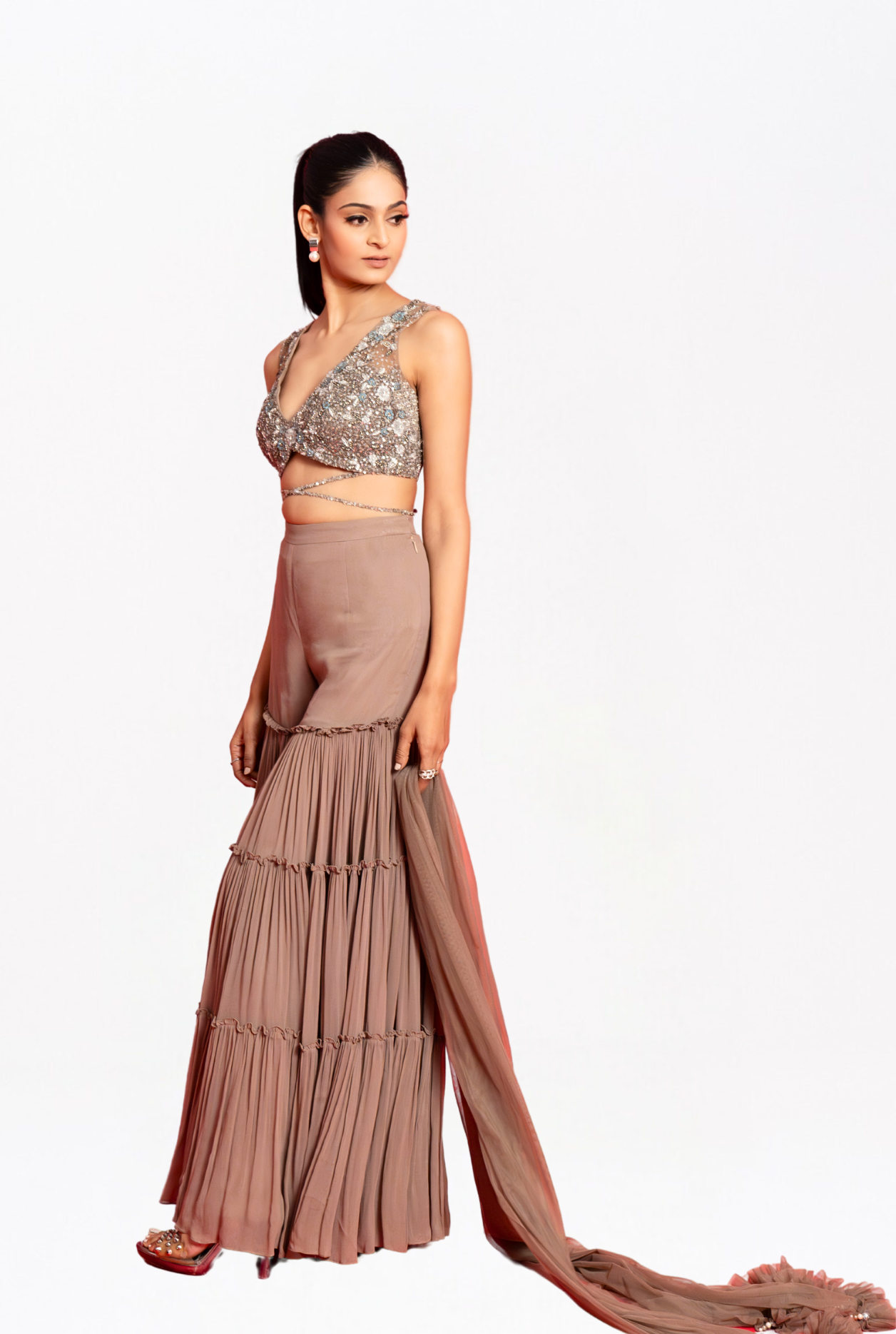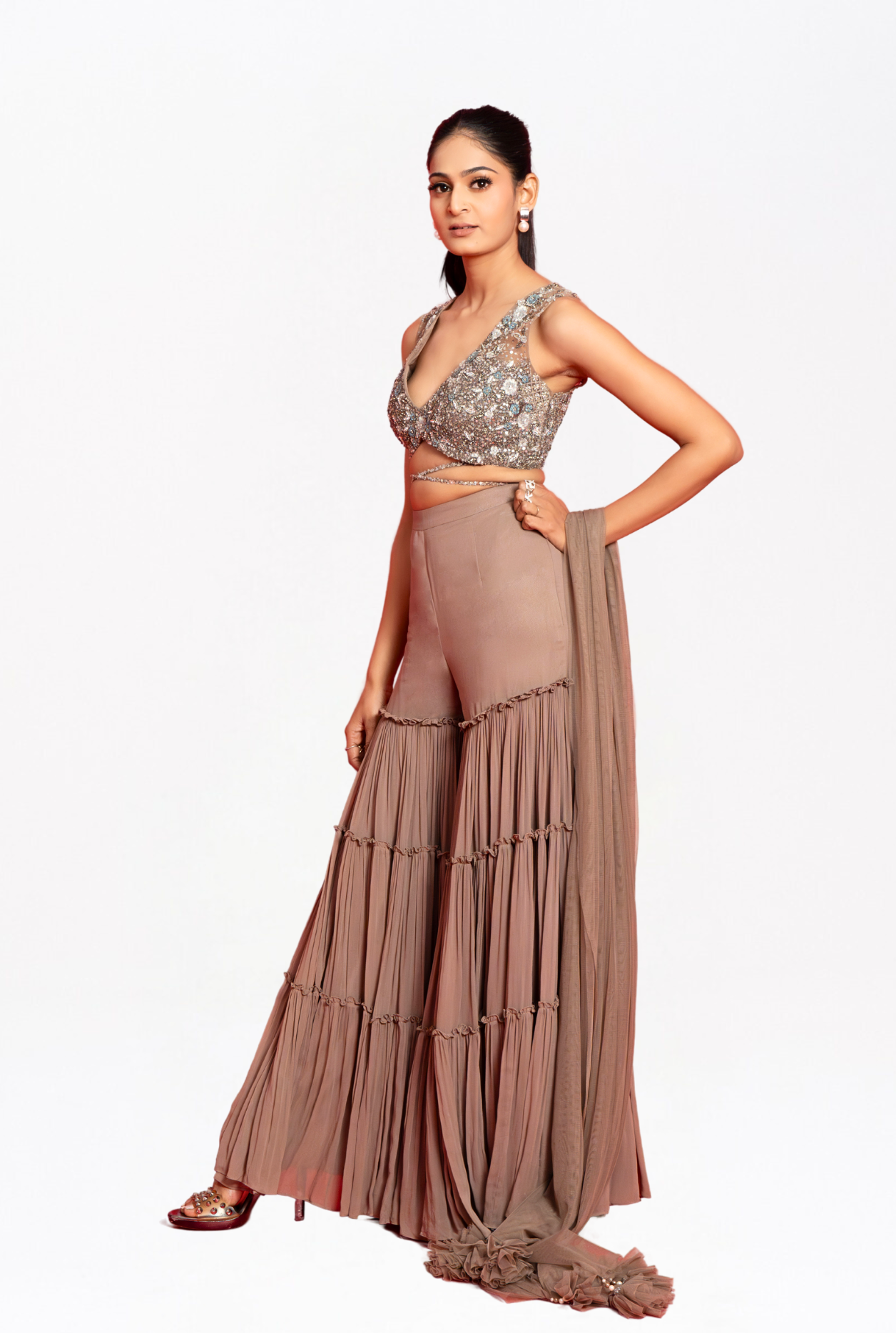 Grey Massively Flowy 3-Layer Georgette Palazzo, paired harmoniously with a tonal sequin and zari embroidered blouse. Complete your ensemble with a stunning dupatta, adding the perfect finishing touch to your look.
