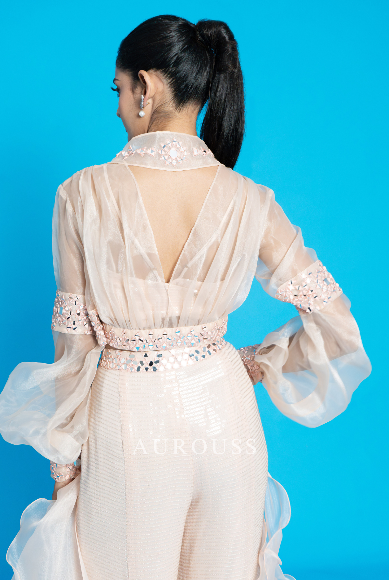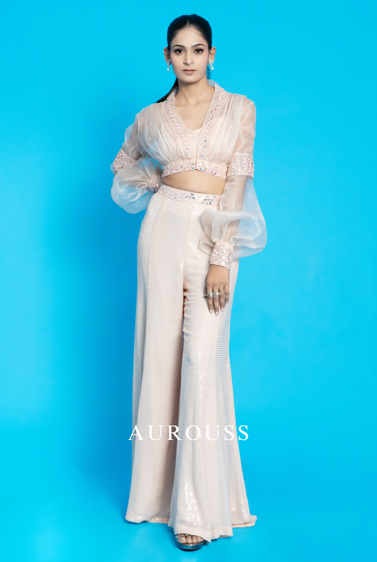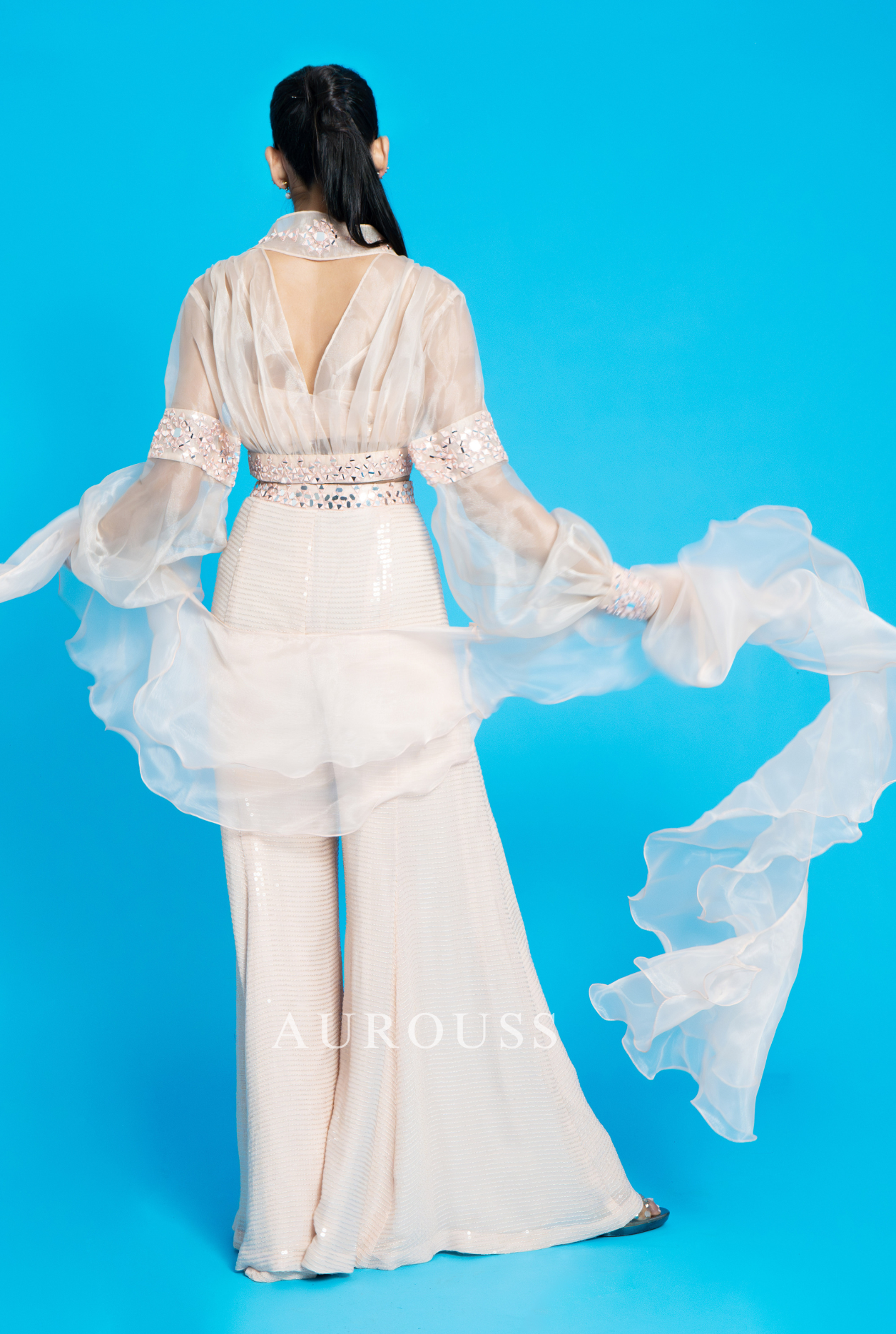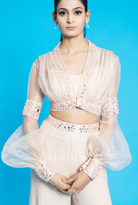 Peach Water Sequins Flair Palazzo paired with a delicate Bralette and an Organza Short Jacket adorned with intricate mirror work. This ensemble is perfect for those who love to add a touch of glamour to their wardrobe. Complete the look with a stunning Organza Ruffle Dupatta for a truly mesmerizing outfit.