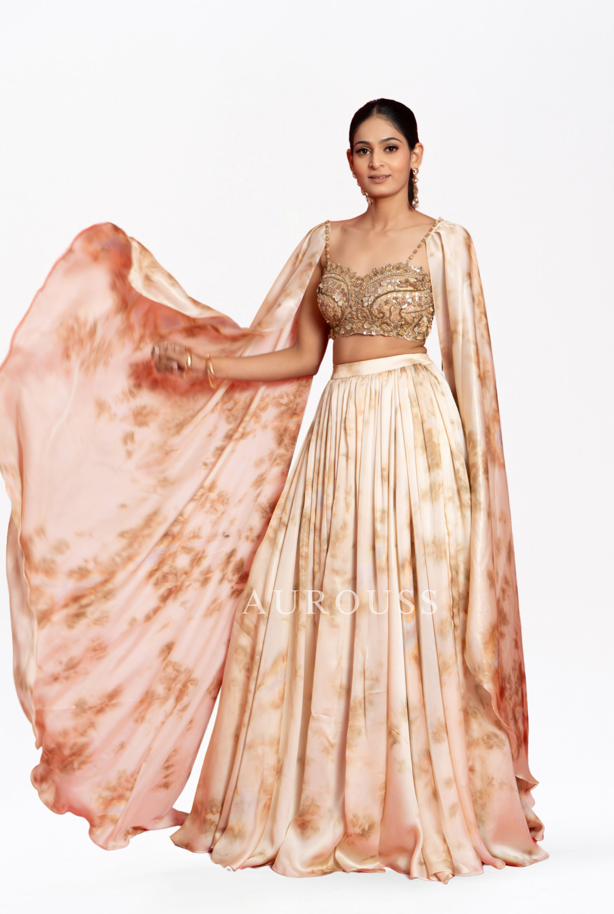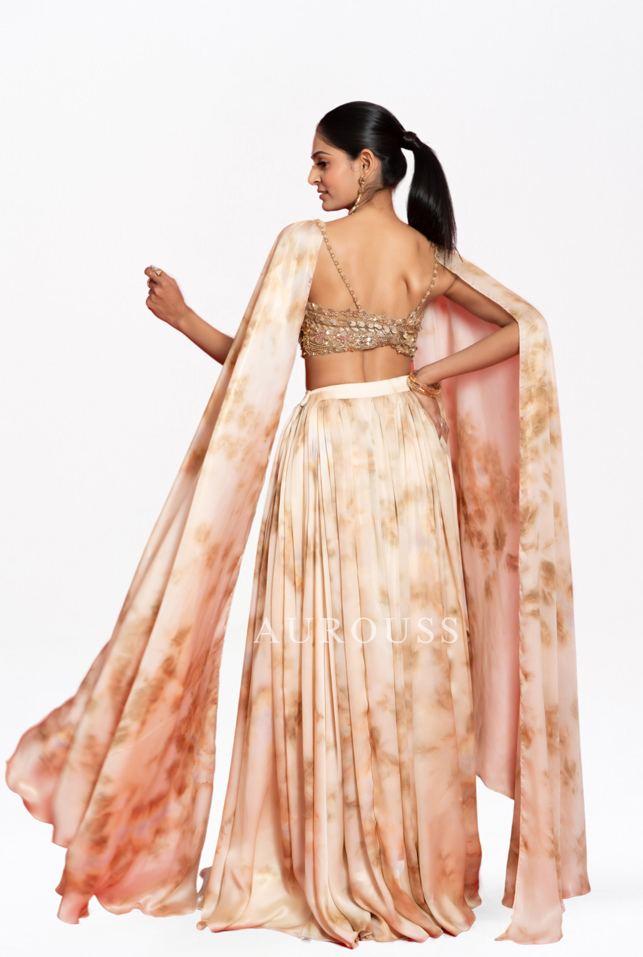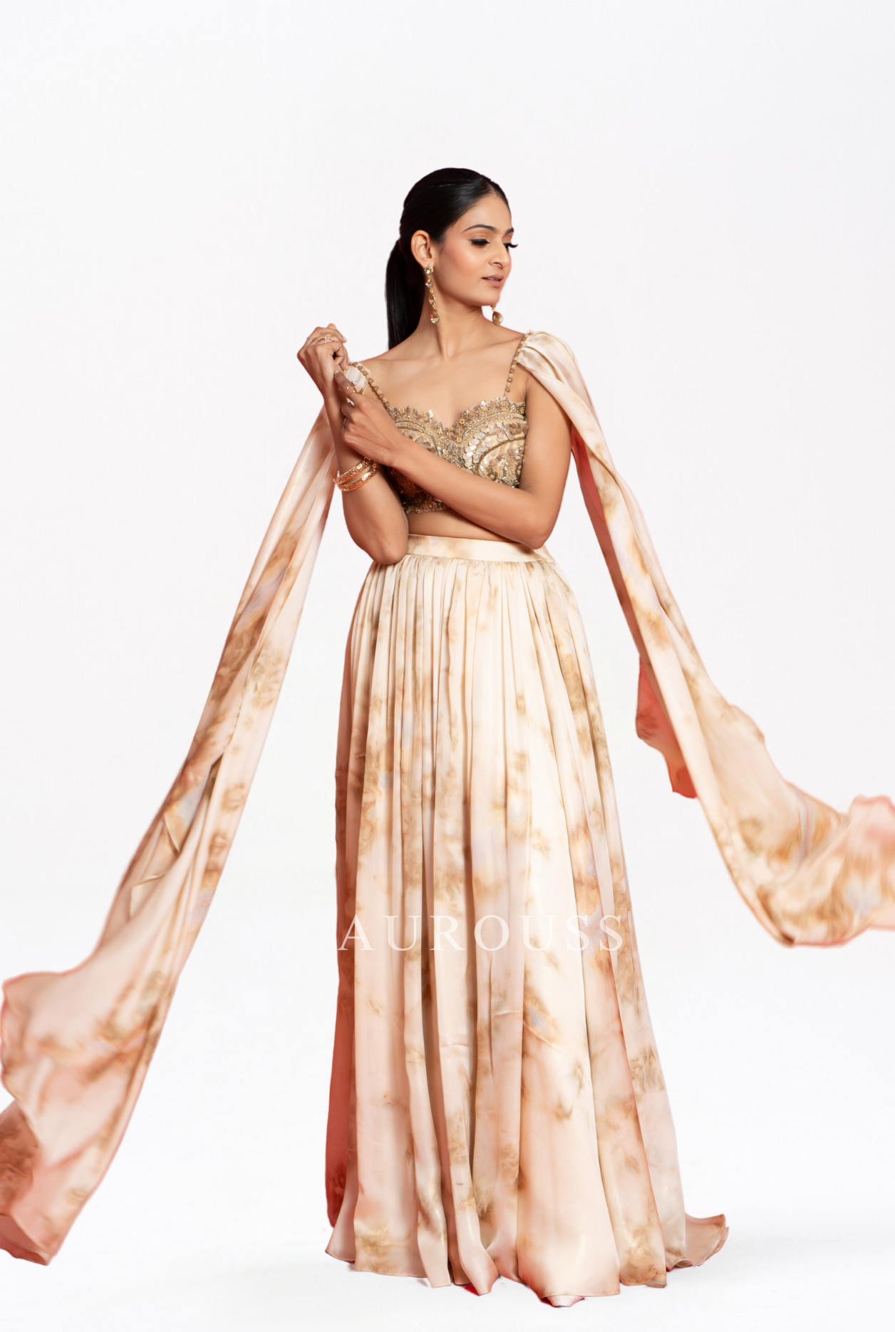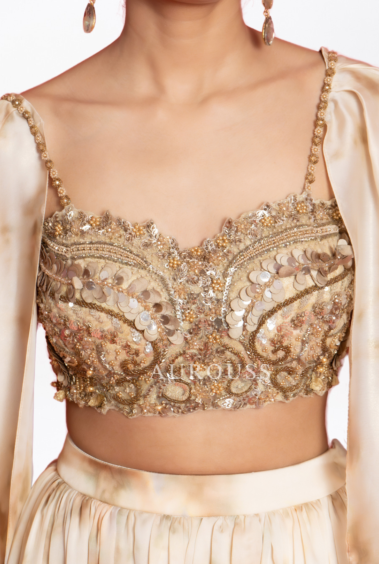 Gold Falling Sleeves Blouse, adorned with exquisite gold cutdana, sequins, crystals, and 3D leaves hand embroidery. Paired elegantly with a flowy mug dye print lehenga made of ivory fabric, this ensemble exudes sophistication and charm.