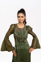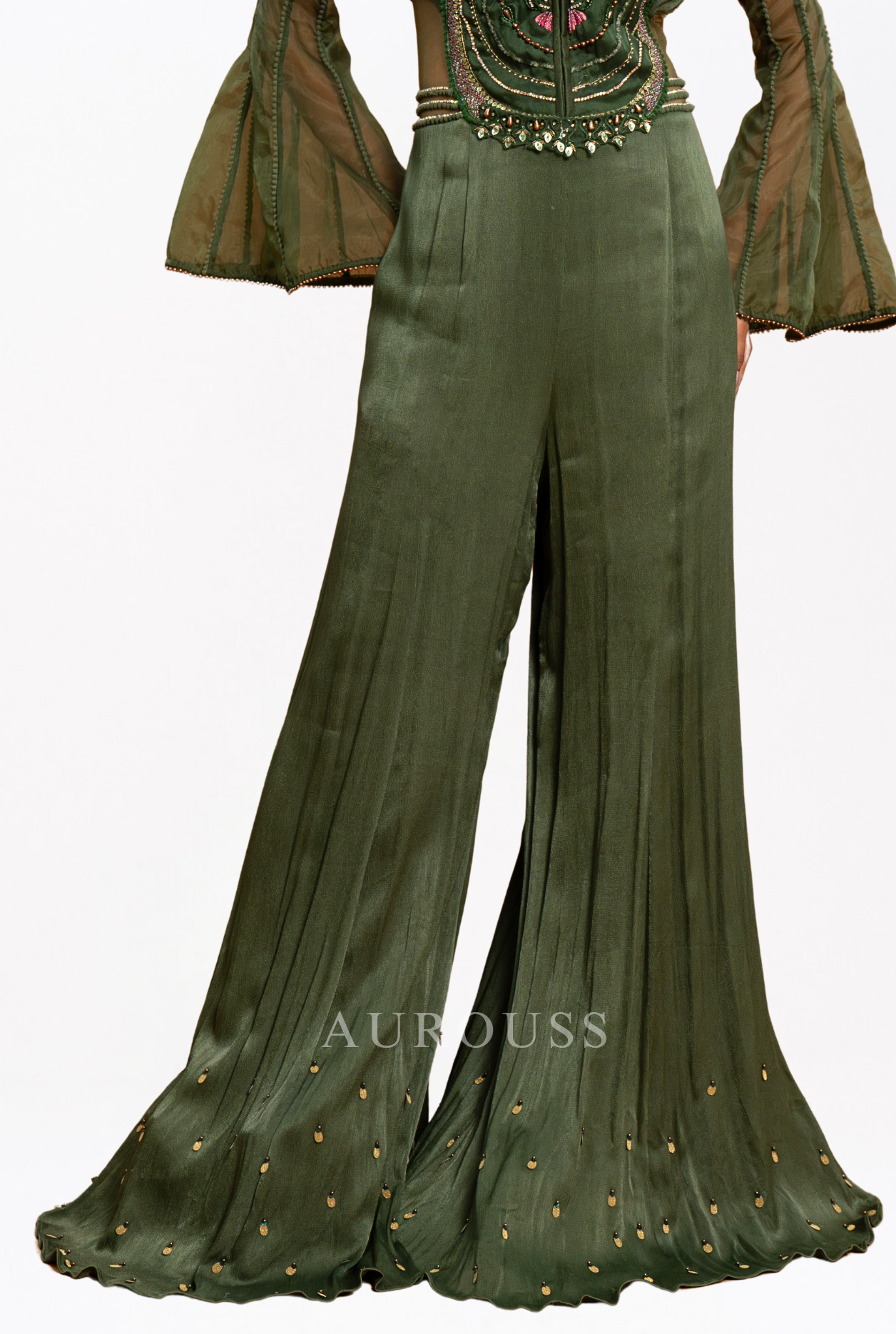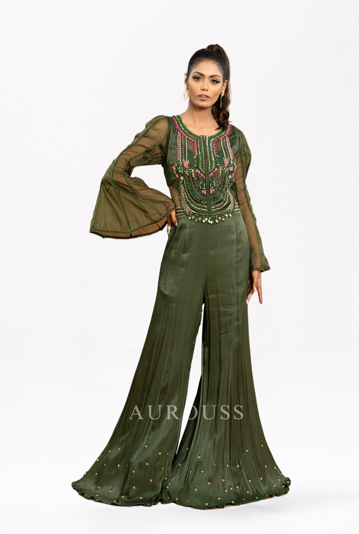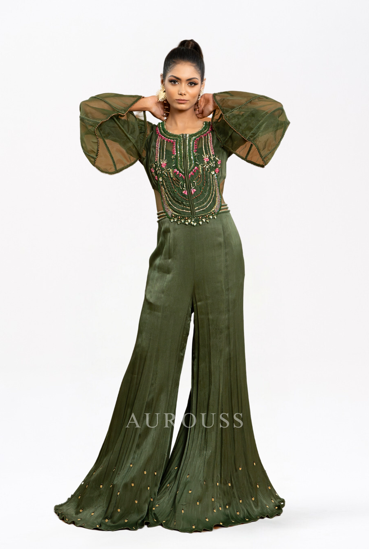 Mehendi Green Flair Jumpsuit, featuring kalidaar sleeves and convenient pockets for added functionality. This exquisite piece is adorned with captivating hand embroidery, meticulously crafted using resham, cutdana, sequins, pearls, crystals, and beads. Perfect for those special occasions, this jumpsuit effortlessly combines elegance with modern flair.